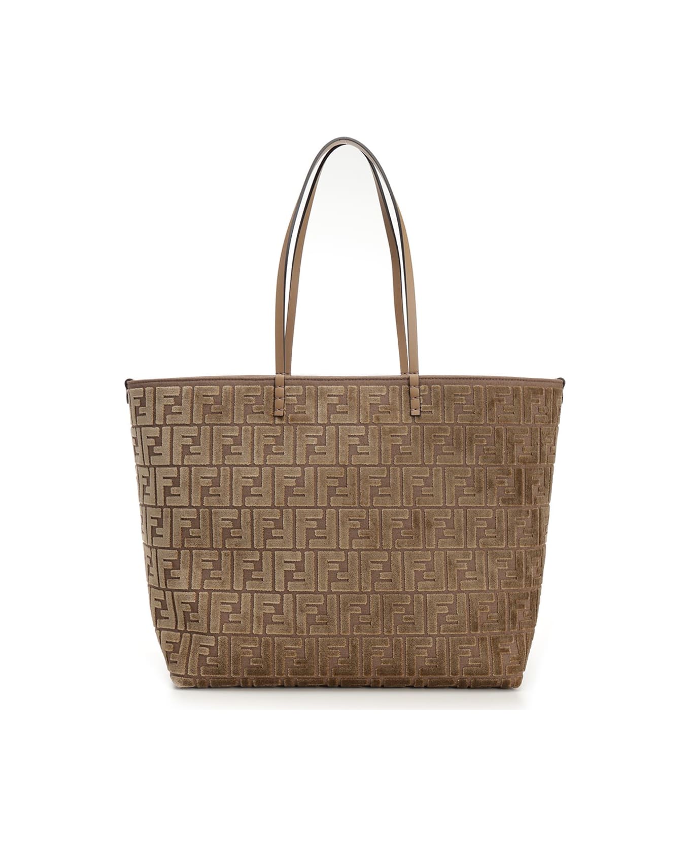 "Roll" large tote bag from Fendi, created in 1997 together with the Baguette and designed to be worn together. Reversible design, made of jacquard fabric with iconic FF chenille motif on the other. Removable internal zip pocket in leather and metal accessories with golden finish. Composition: 34 x 31 x 21 cm