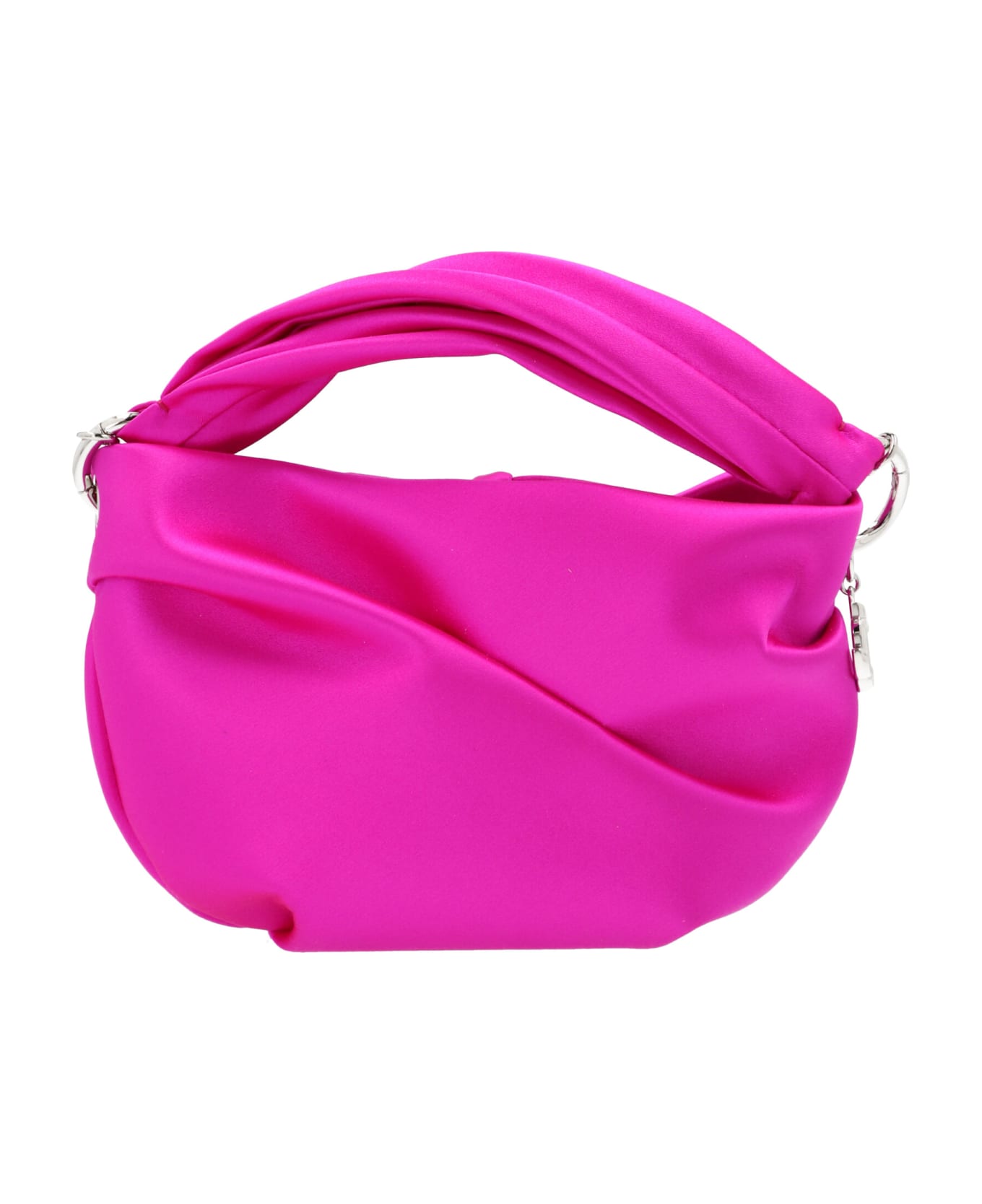 Draped satin handbag featuring a fabric handle and a chain shoulder strap. Composition: