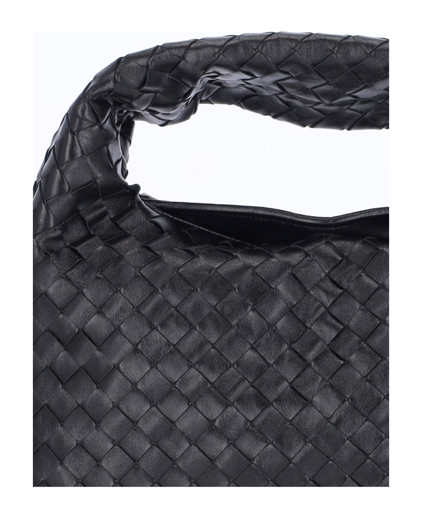 Bottega Veneta small 'Hop' bag in black woven leather with top handle, magnetic closure, inner zip pocket, main inner compartment.