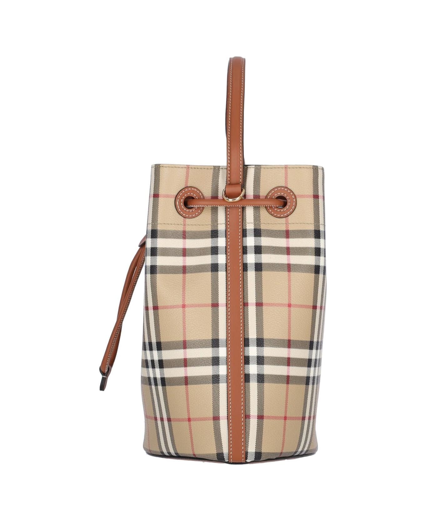Burberry 'TB' small bucket bag in beige fabric with multicolor 'Check' pattern, leather trims, handle, adjustable and removable shoulder strap, drawstring closure, gold metal logo buckle detail, inner slip pocket, main inner compartment.
