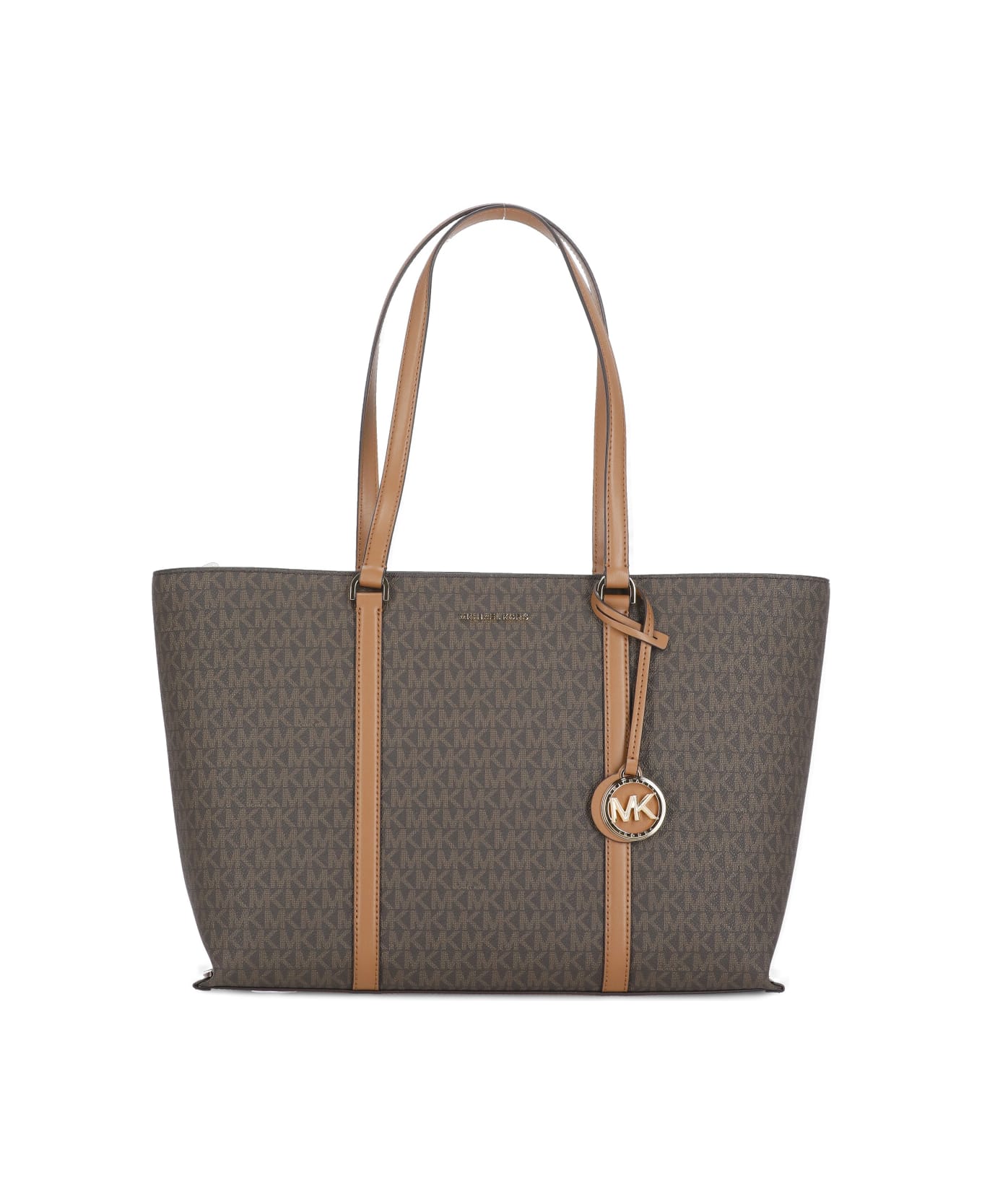 - Brown Michael Kors shopping bag for woman - Two handles - Front metal logo - One compartment with zip fastening - Two compartments with magnetic fastening - All-over monogram pattern - Charm with metal logo