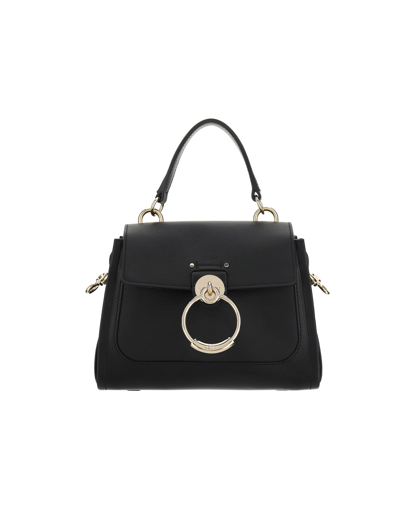 Calfskin Tess Bag by Chloé, pebble structure, metal ring details, gold-coloured hardware on the front, hinged door with magnetic clasp, leather shoulder strap, single rounded handle, sachet pocket on the front, sachet pocket on the back, inner pocket with zip and integral lining.