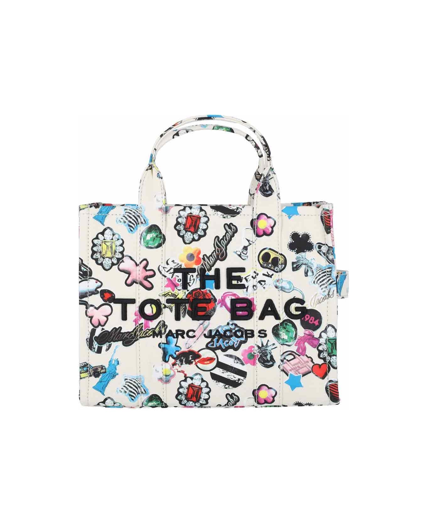 Marc Jacobs The Sticker Canvas cream cotton tote bag with multicolor print pattern, two handles, adjustable and removable shoulder strap, zip closure, black logo patch on the front, side strap, logo patch on the back, one inner card slot, and one main inner compartment.