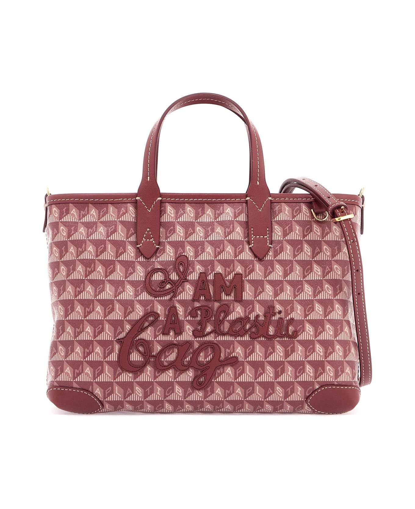 The Anya Hindmarch tote bag from the I Am A Plastic Bag line is made using plastic bottle and windshield scraps to create coated canvas bags and accessories. The design features leather lettering sewn on the front and is finished with smooth leather details. It has a zip closure, an unlined interior with a flat pocket, double top handles, an adjustable and removable shoulder strap for a crossbody look, a D-ring on the front, and protective leather inserts at the base. The metal