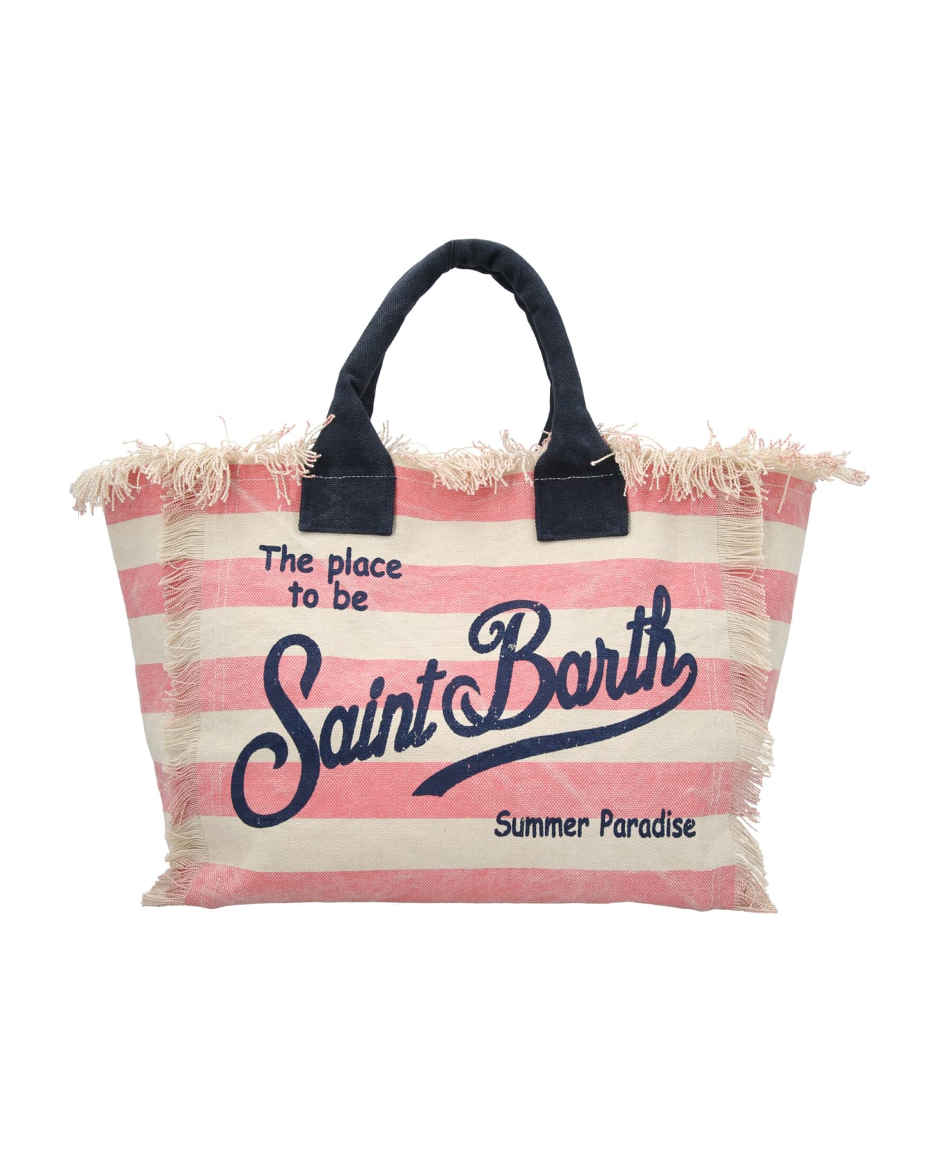 Vanity' striped incanvas shopping bag with front and back logo print, fringes at the edges, double contrast handle and a zip closure. Composition: