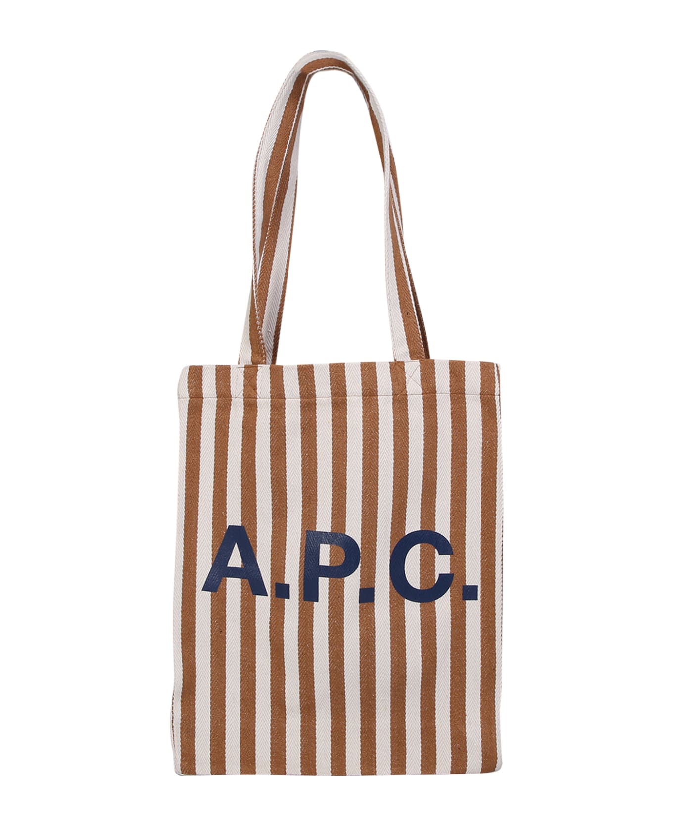 Vertical stripe print. Logo print on the front. Two long top handles. Open top. Main compartment. Color: caramel