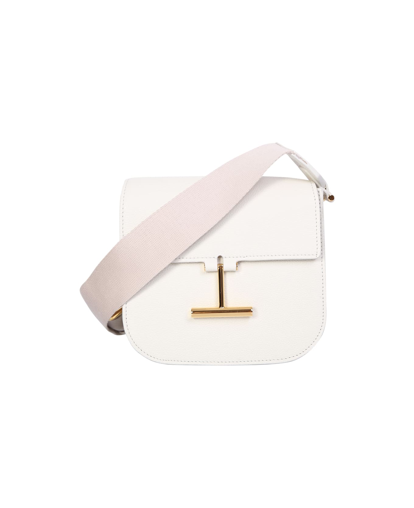 Foldover top. Magnetic fastening. Main compartment. Internal zip fastening. Rear slip pocket. Front logo plaque. Adjustable shoulder strap. Gold tone hardware. Color: white