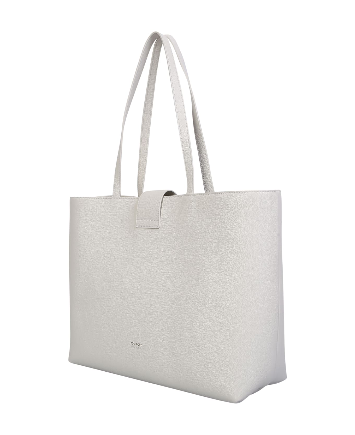 Foldover top. Front TF logo plaque. Magnetic fastening. Main compartment. Internal slip pocket. Two top handle. Engraved logo to the rear. Pebbled texture. Gold tone hardware. Color: white