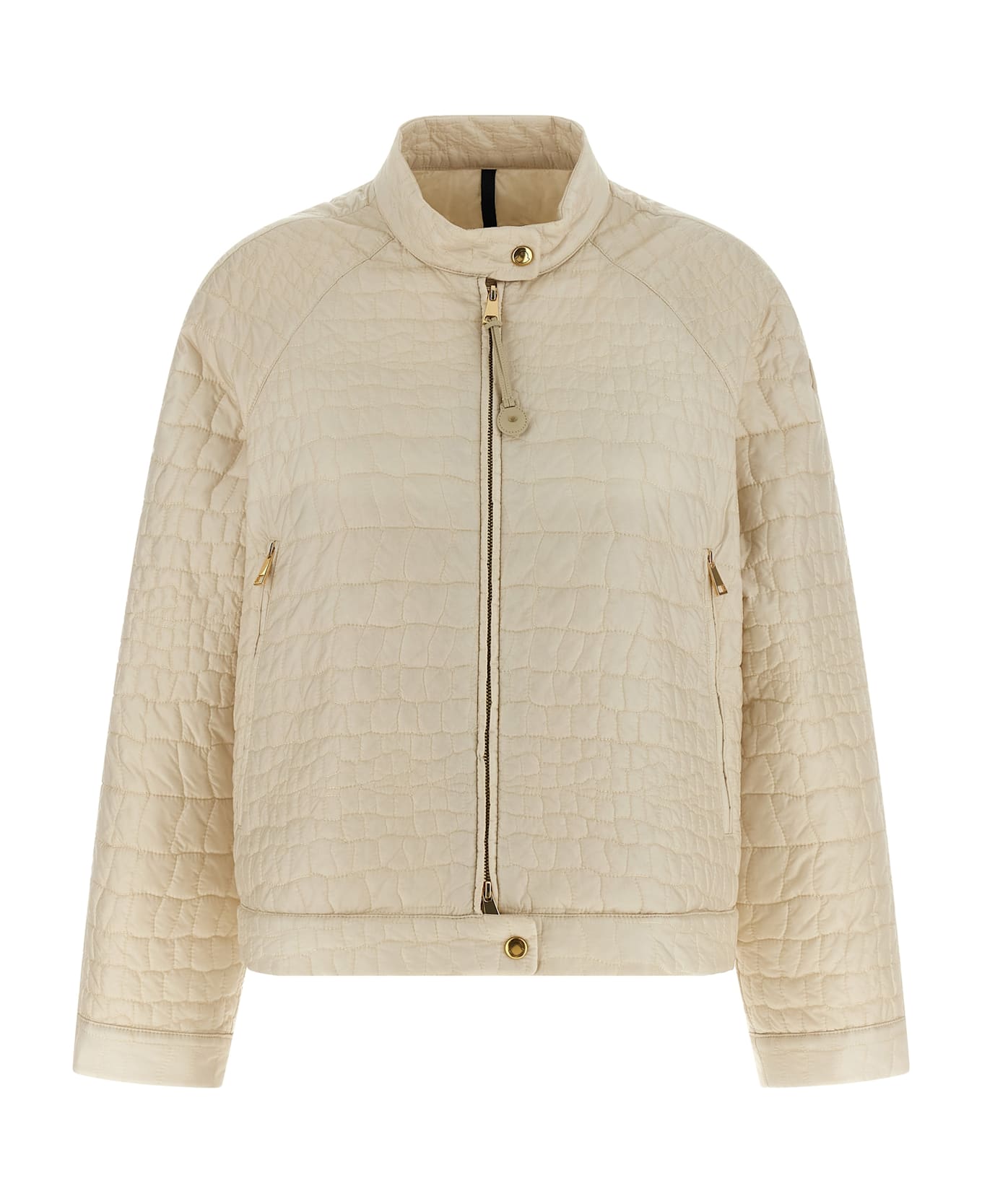 'Aubrietaa' quilted tech fabric down jacket, flared silhouette, high neck, front zip and snap button closure, pockets, long raglan sleeves with cuffs and tone-on-tone leather logo patch appliqué.