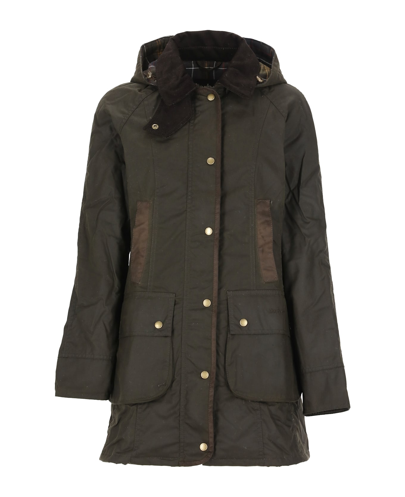 - Olive green Barbour cotton jacket for woman - Collar - Front zip and buttons fastening - Long sleeves - Two front flap and buttons pockets - Two front slit pockets - Front embroidered logo