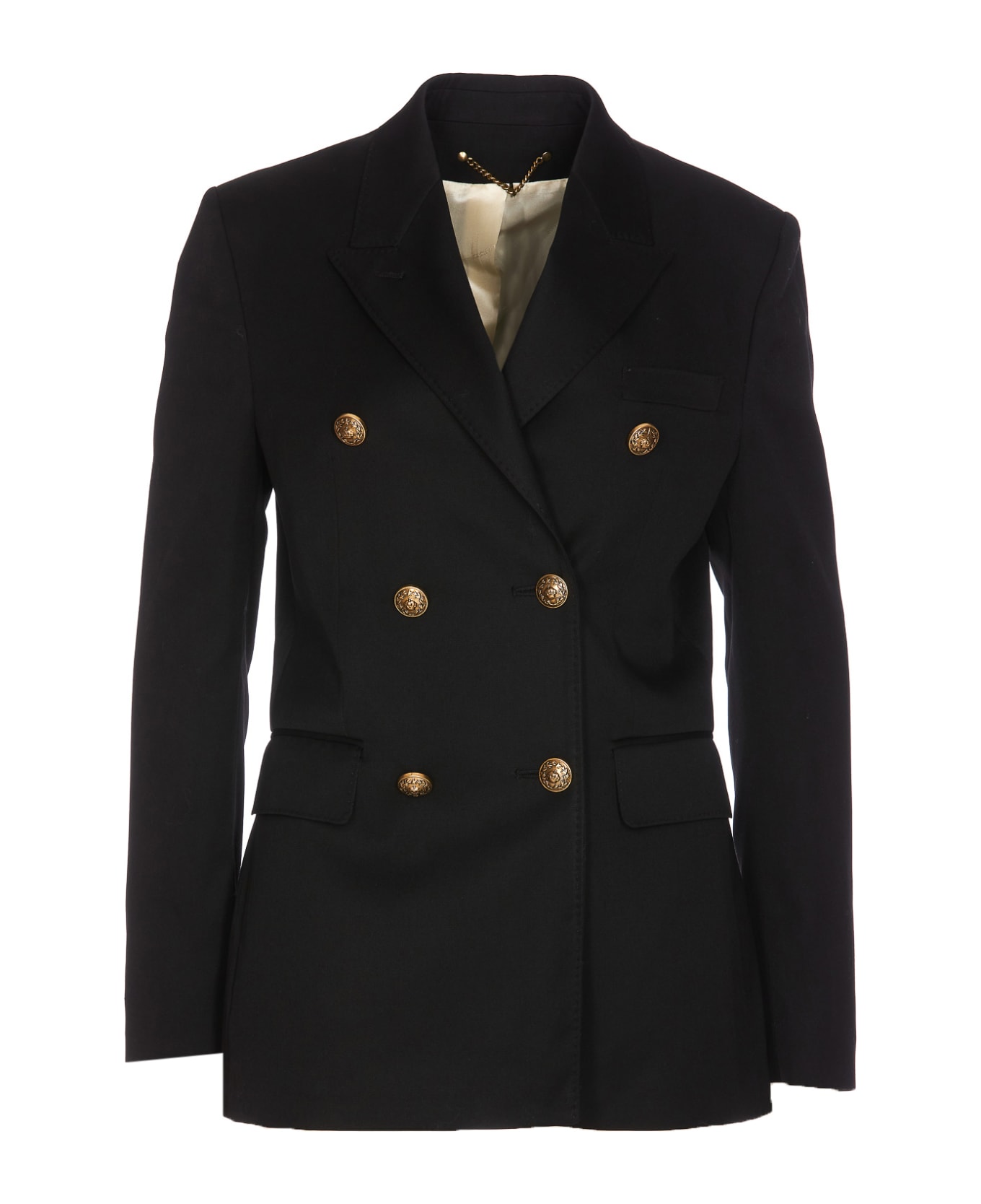 Golden Goose black Diva jacket with frontal double breasted golden buttons closure, V-neck, long sleeves, golden buttons details on cuffs, reverse detail on the front, mini split on the back