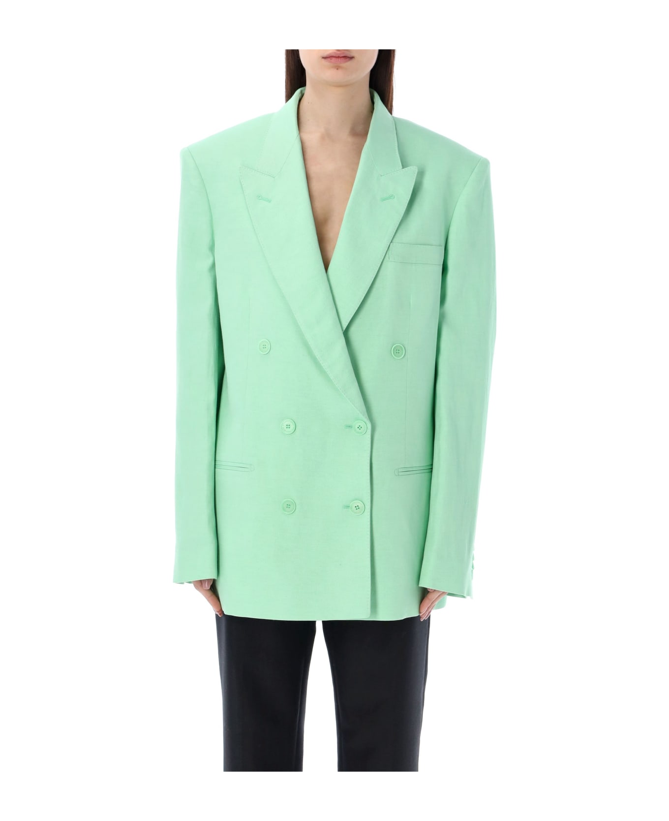 Linen Blend Double Breasted Blazer By Stella Mccartney. Featuring: Lapel Collar Double Breasted Buttons Closure Chest Pocket Front Welt Pockets Shoulder Pads Back Vents Oversize Fit The Model Is 1,72 M Tall And She's Wearing Size 40