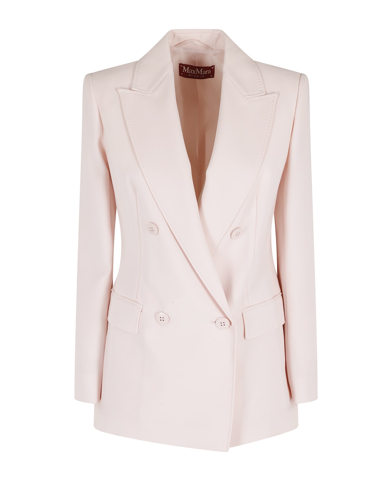 Category: Jacket Article: Blazer lapel Brand: Max Mara Studio Color: Pink Neckline: Peaked lapels Pockets: Two front welt pockets with flap Details: Rear slit, tailored stitching Closure: Double-breasted button closure SIZE AND FIT Fit: Regular Cut: Strai