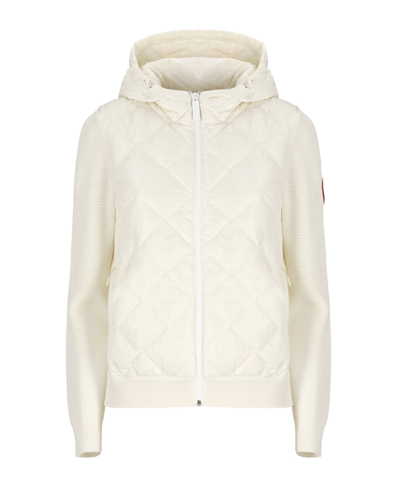 - Ivory Canada Goose jacket for woman - Hood with drawstrings - Long sleeves - Contrasting color iconic logoed patch at left sleeve - Two side zip pockets - Front zip fastening