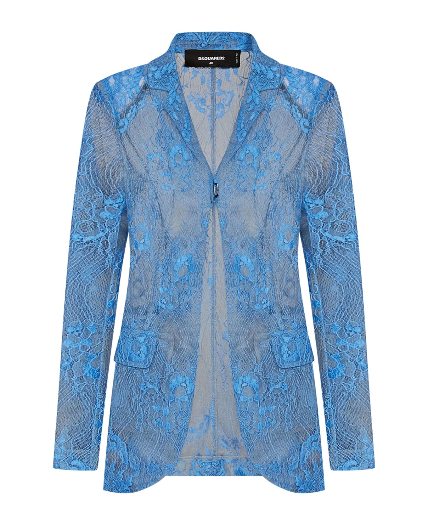 - Notched lapel; Long sleeves, shoulder pads, cuffs with silver metal hook closure