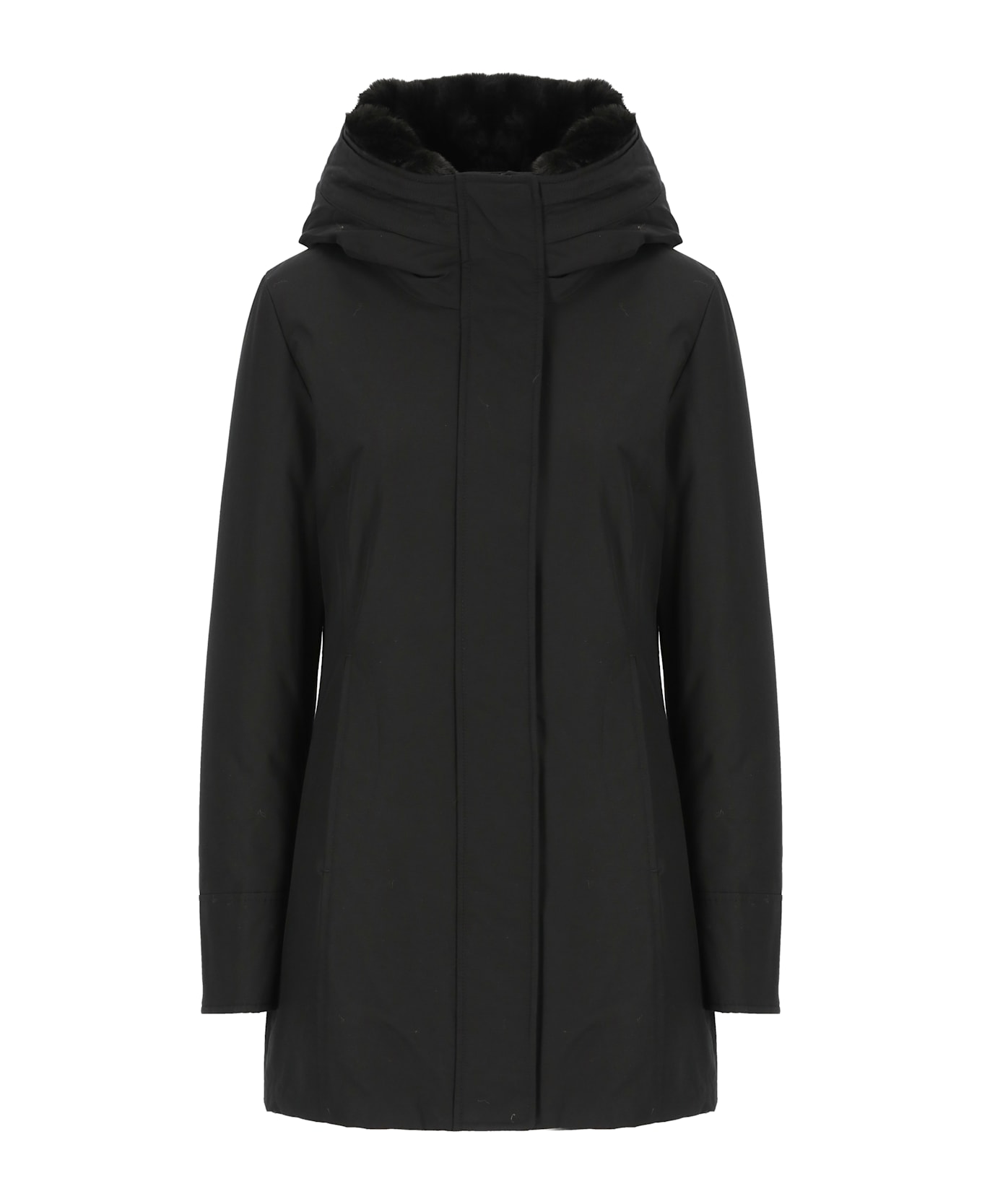 - Black Woolrich parka for woman - Synthetic fur hood - Long sleeves - Logoed patch at left sleeve - Two front pocket with snap buttons - Front zip and snap buttons fastening