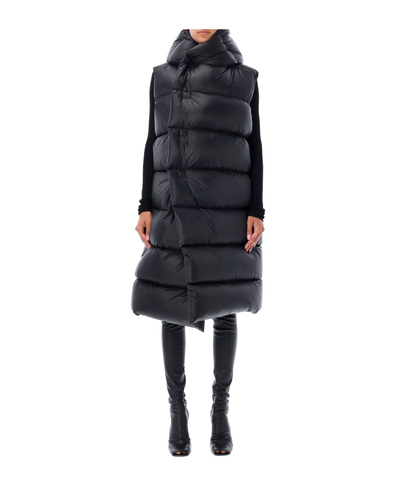 Luxor Hooded Liner Jacket By Rick Owens. Featuring: Knee Length Sleeveless Hooded Quilted With Horizontal Stitching Details Concealed Snap Closure On Front Two Side Pockets With Snap Closure Signature Cotton Webbing Strap Rivet Details Model Is 1,72 M Tall And He Is Wearing Size 40