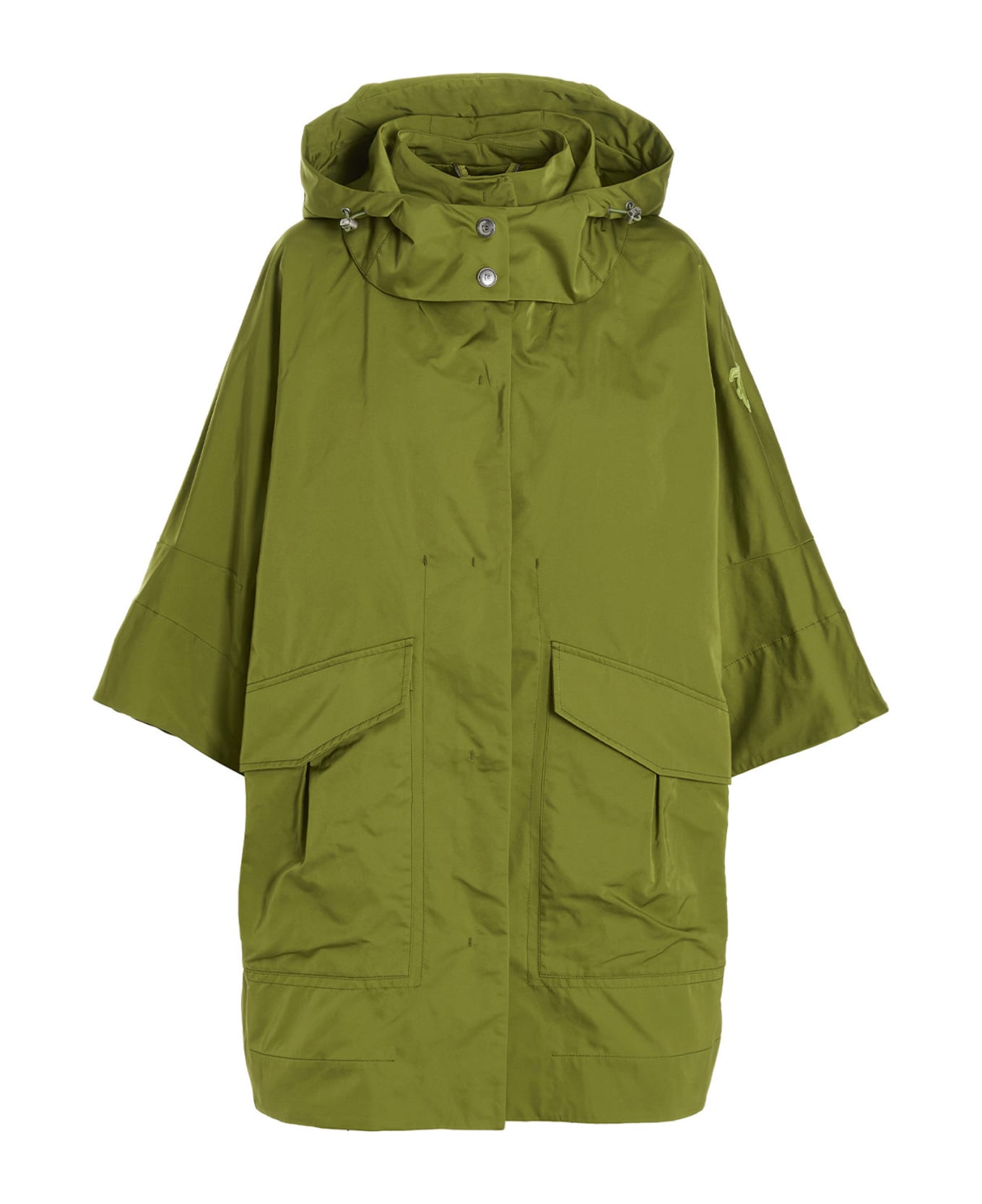 Satin parka with button closure, removable hood, pockets and 3/4 sleeves.