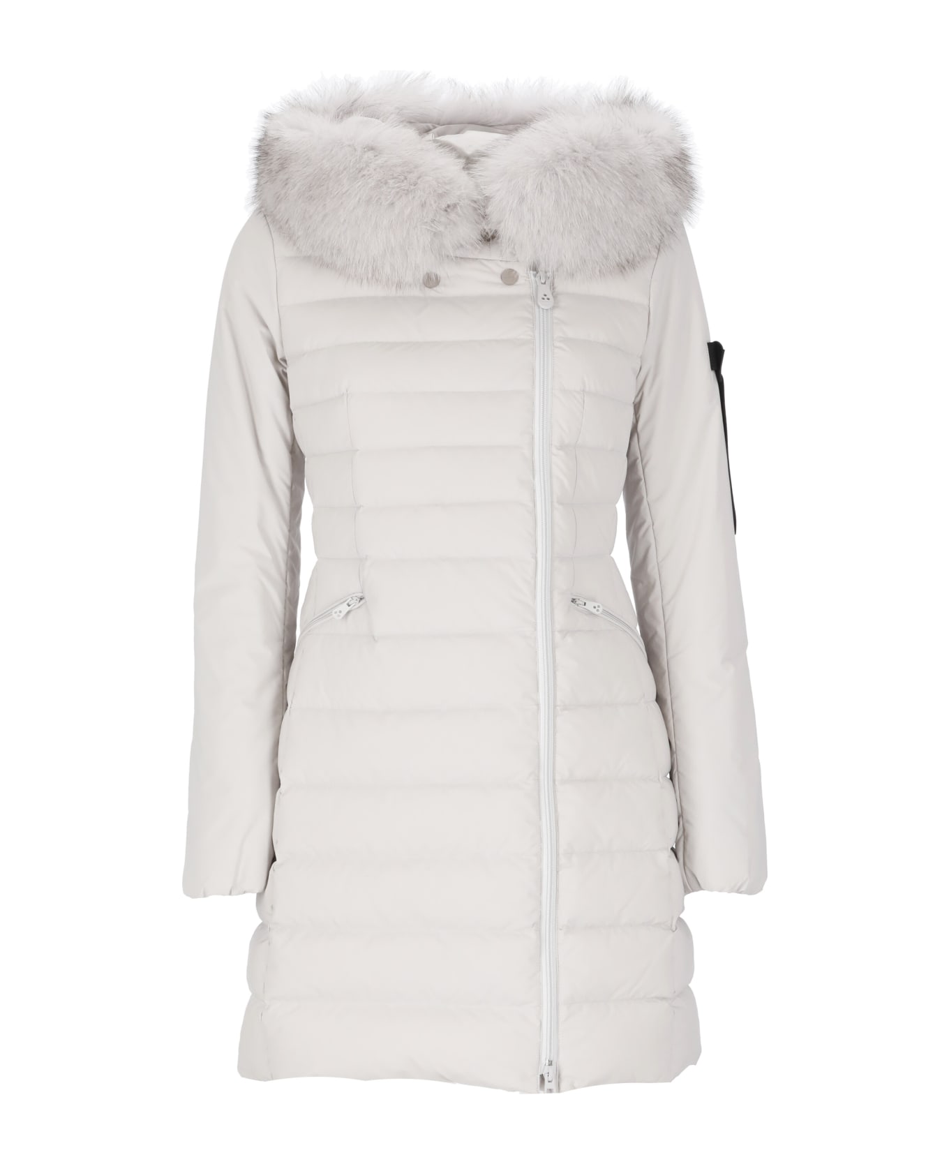 Seriola Down Jacket With Fur from Peuterey: - Lightweight nylon poplin and polyester microfiber Peuterey woman's grey quilted long down jacket
