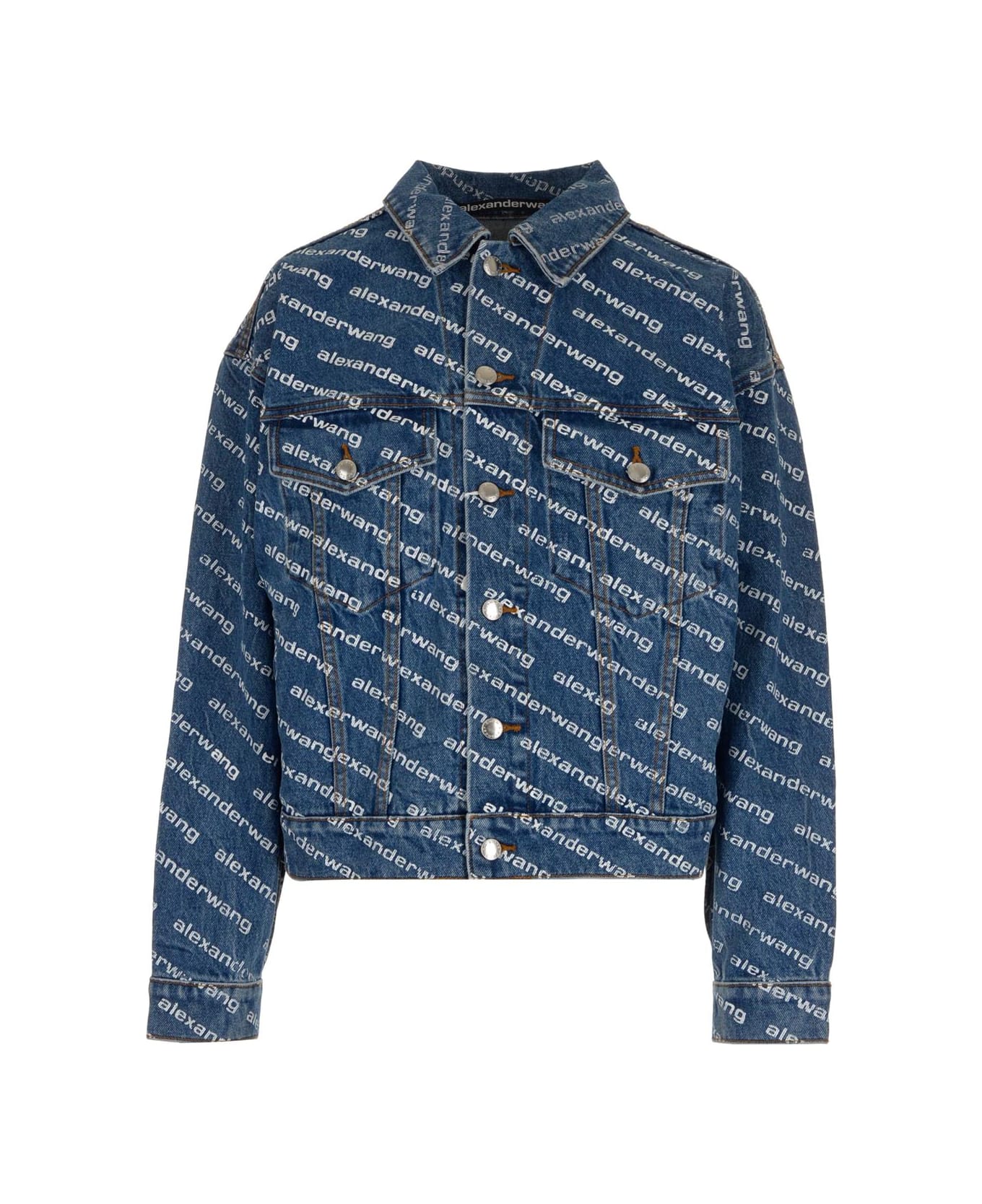 All over logo denim jacket from Alexander Wang with wide sleeves with cuff, straight line, front buttons.