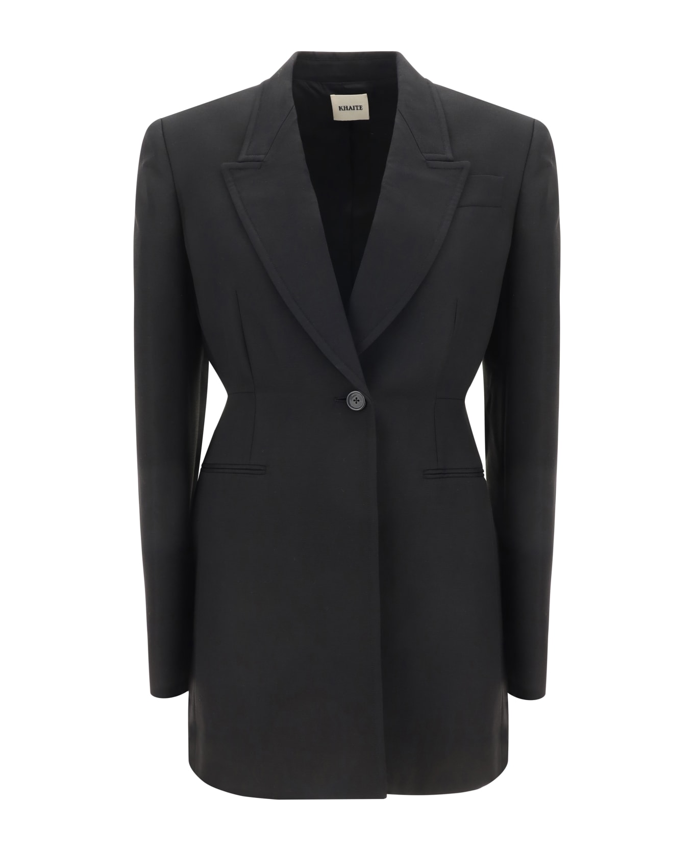 Beckett blazer jacket by khaite, spear lapels, front button closure, two welt pockets on front panel, slit pocket on front, monochrome pattern, regular fit. Composition: 75% % Viscose, 25% % Polyamide