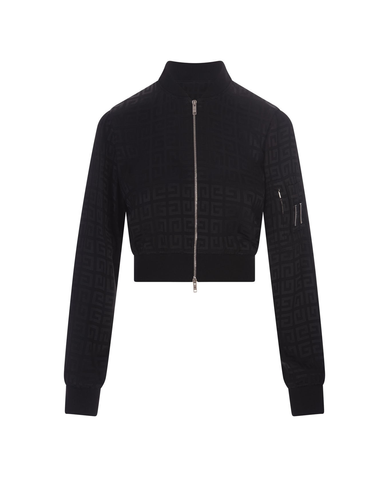 GIVENCHY short bomber jacket in black viscose jacquard with all-over 4G pattern and metal zip fastening. On the left sleeve: one zipped pocket and one breast pocket with GIVENCHY engraved metal clip. Tone-on-tone knitted collar, hem and cuffs. Composition: Composition: 70% Acetate, 30% Viscose.