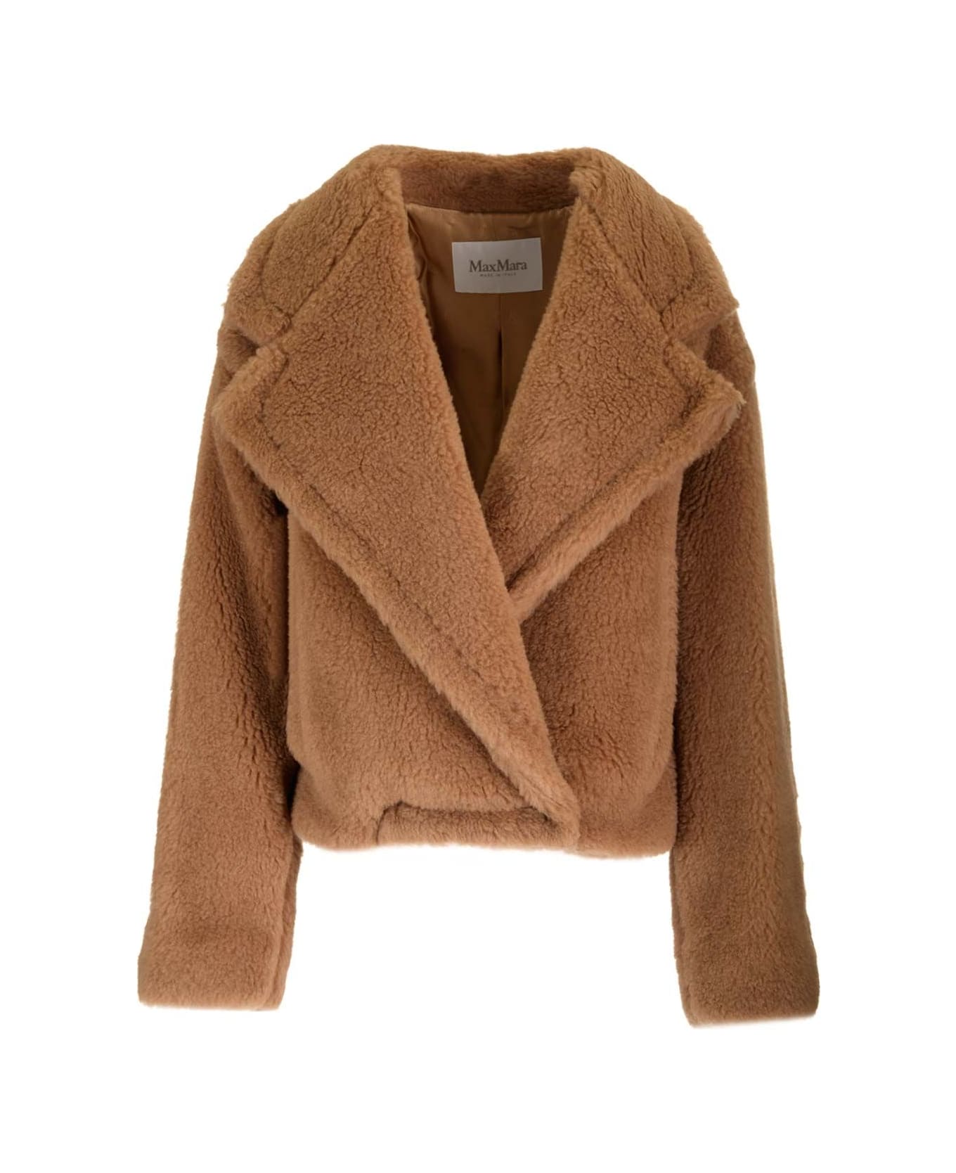 Cropped jacket in camel Teddy fabric on a silk base by Max Mara, characterized by an oversized silhouette with gathered waist on the back and leather frogs on the sides and double-breasted closure. Wide lapel collar, low armhole and welt pockets.