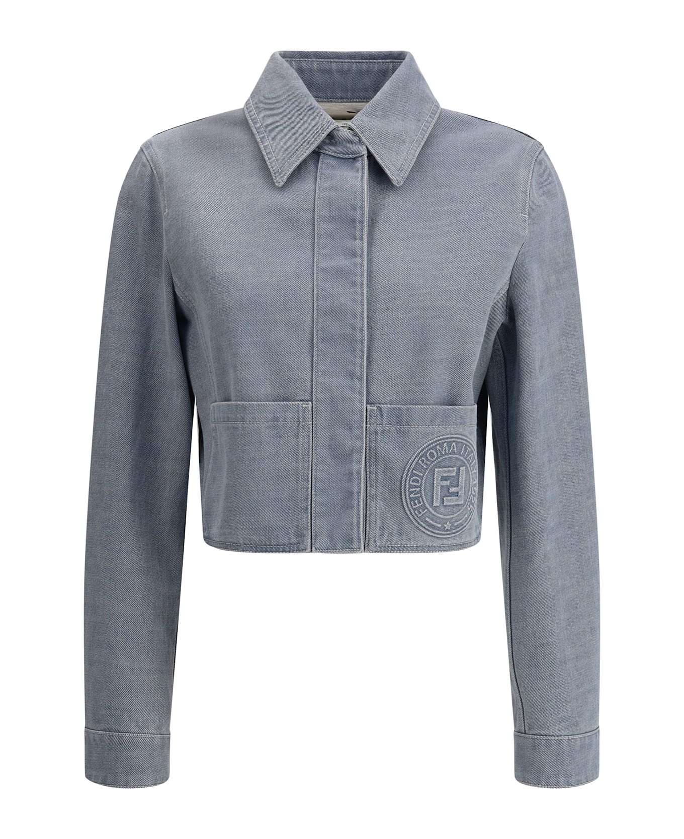 Fendi's cropped denim jacket is a bold, modern piece perfect for a casual yet sophisticated look. with a classic collar and concealed front button closure, it offers a clean, contemporary design. the two front patch pockets and the brand's iconic logo on the front add a distinctive touch, making this jacket a versatile and trendy piece.