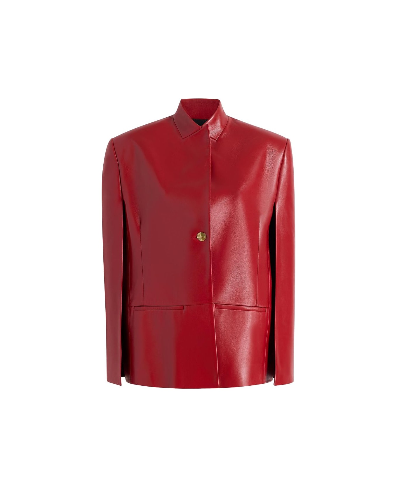 A cape-style leather jacket that balances tailored structure with modern fluidity in buttery soft and exceptionally lightweight nappa lambskin. The stand-collar, open-sleeved silhouette is finished with a single button closure and sleek welt pockets. Lined in silky cupro twill. red long sleeves Composition: Furs & Skins->lambskin100. , 0%