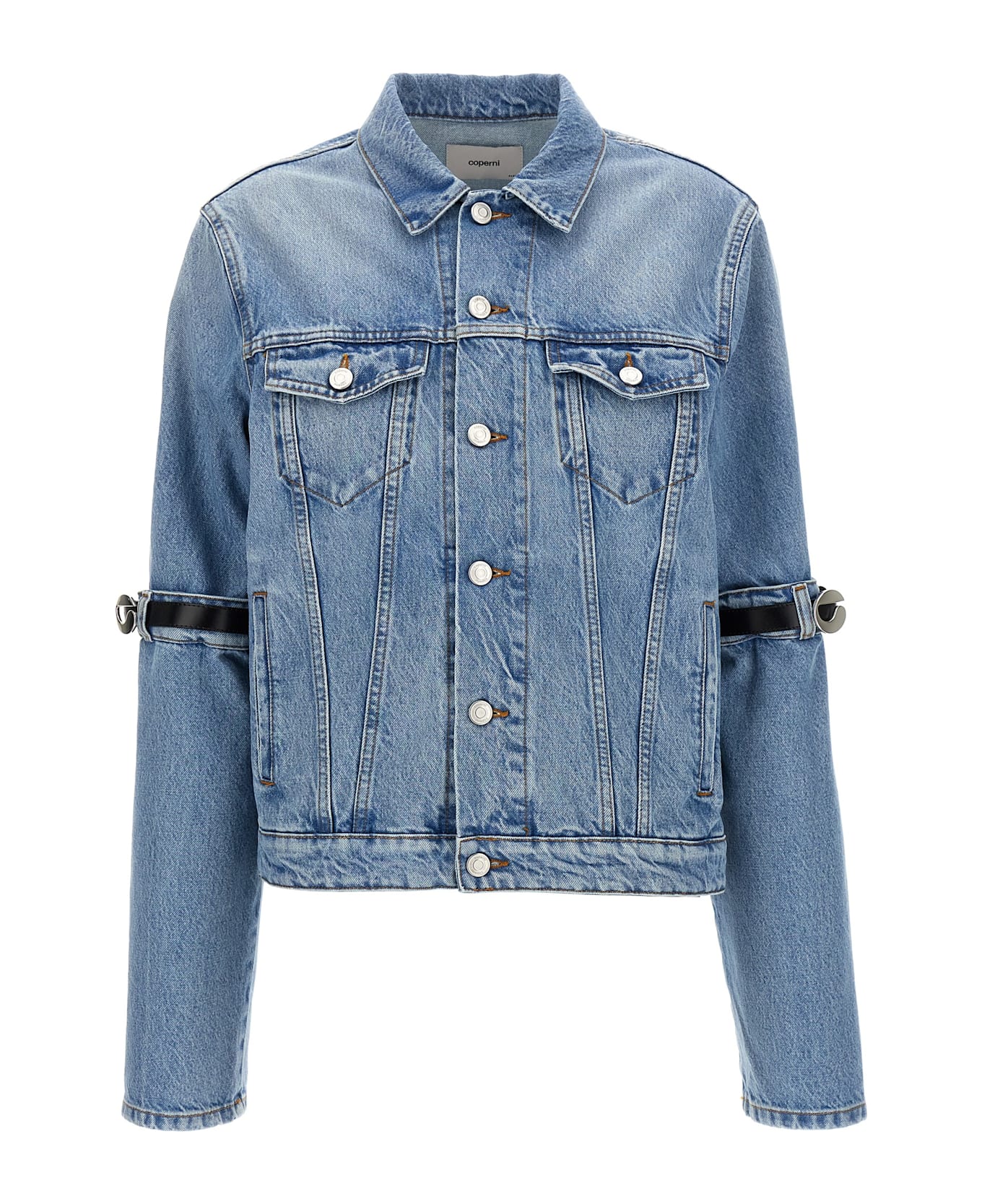 'Hybrid Denim Short' cotton denim jacket with front button closure, pockets, long sleeves with leather strap detail in the middle of the sleeve.