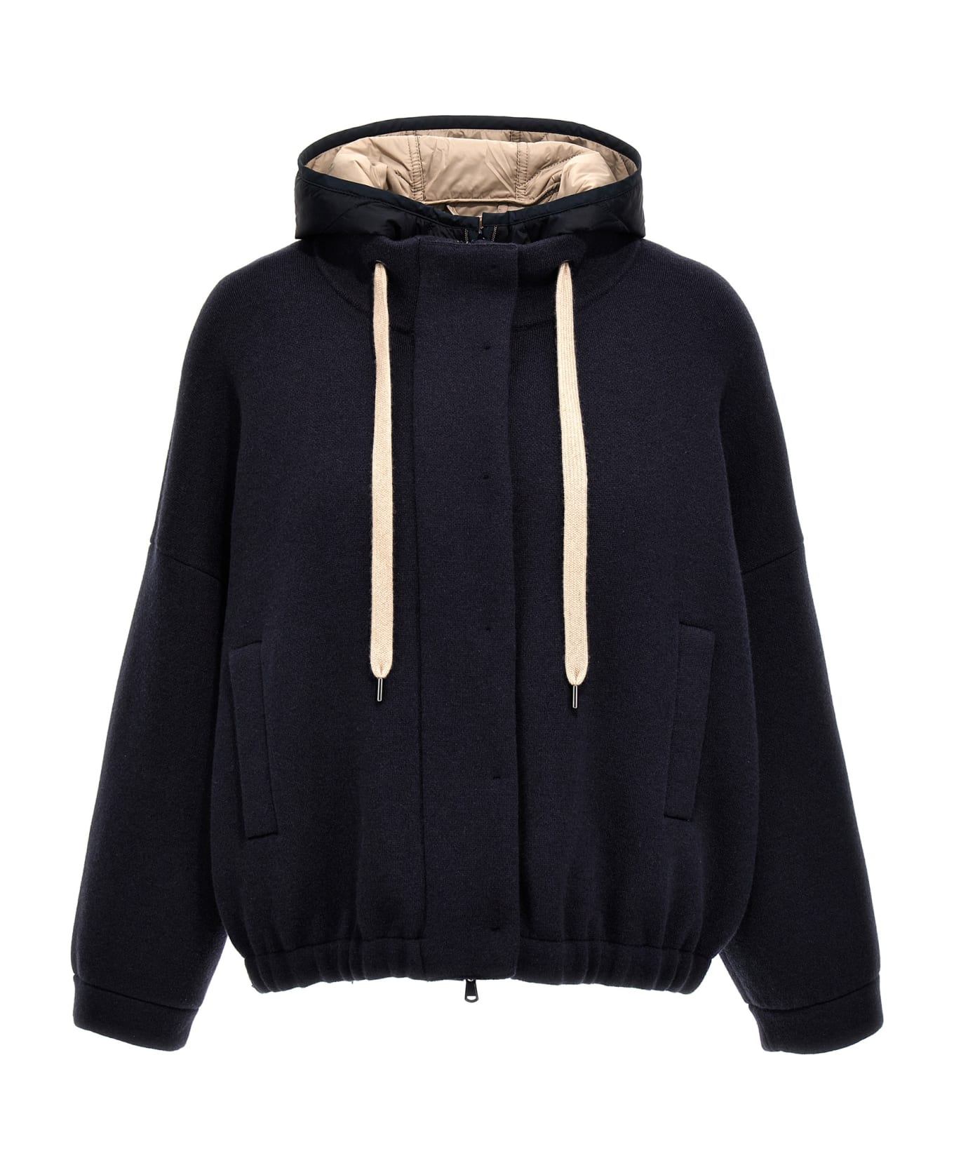 Cashmere jacket with zip and button closure, pockets, long cuffed sleeves, elastic hem, removable vest in slightly padded nylon with hood, zip closure and pockets. Composition: 100% cashmere
