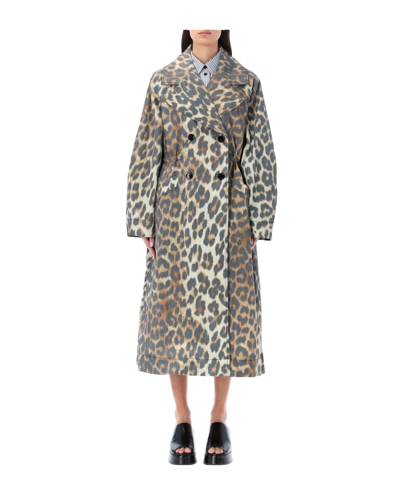 Nylon Leopard Trench By Ganni. Featuring: Wide Notch Lapel Double-breast Button Fastening Elastic Waist Slit Pockets Wide Long Sleeves Long Unlined Model Is 1,72 M Tall And She Is Wearing Size 36