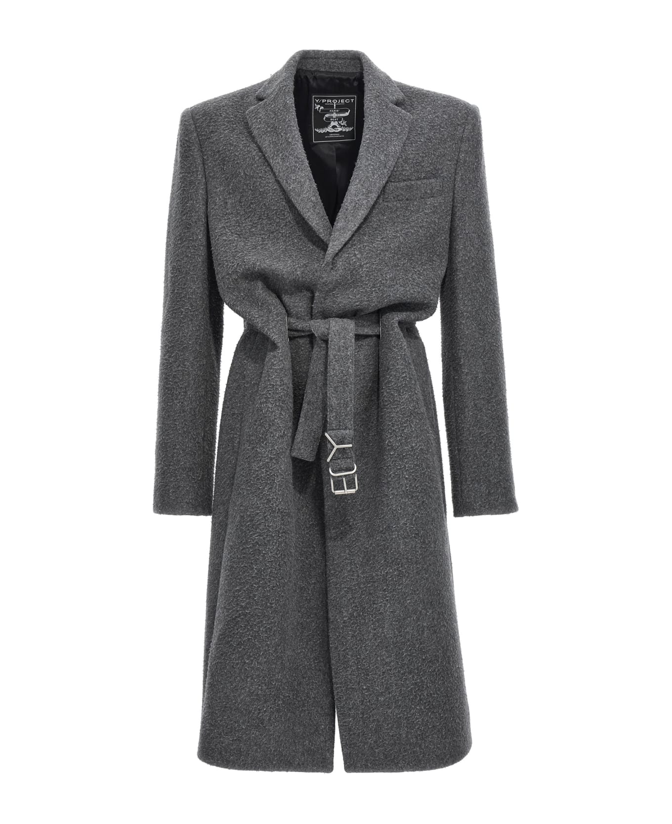 Single breast, brushed-effect wool coat with buttons and a logo buckle belt at the waist.