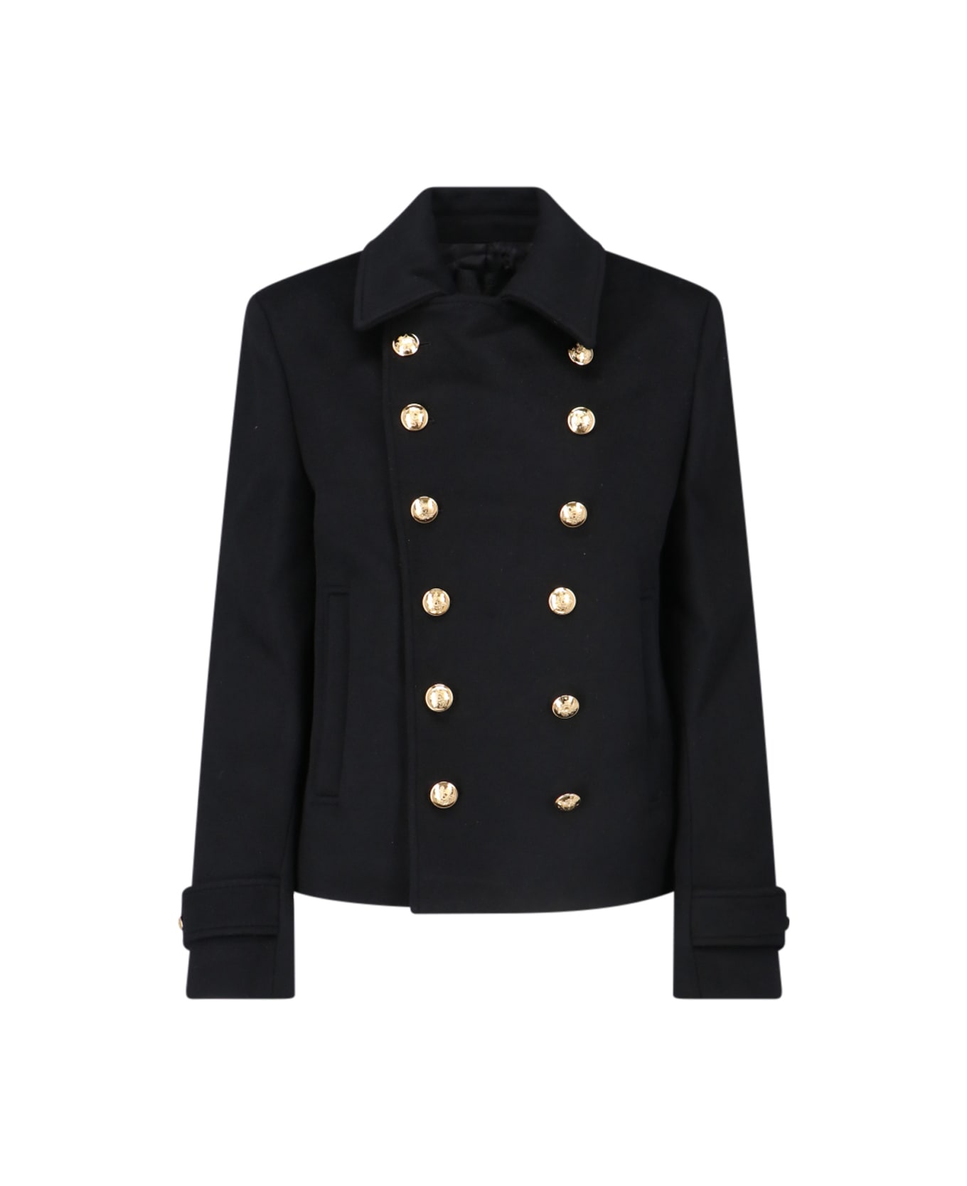 Nili Lotan 'Ornella Peacot' double-breasted jacket in black virgin wool with French collar, structured shoulders, button closure, adjustable straps on cuffs, straight hem.
