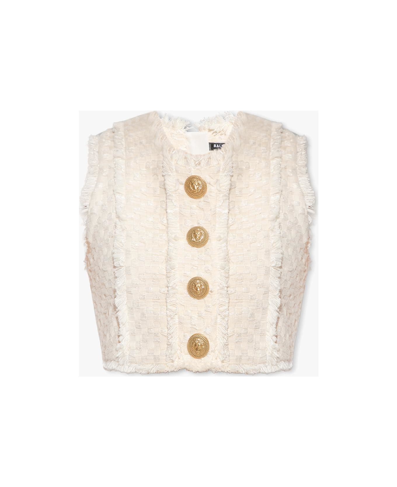 Cream sleeveless top from Balmain. Crafted in lurex tweed with a cropped fit, this style features a back zipper, decorative gold-tone buttons with a signature lion head and fringe detailing on the round neck, shoulders and bottom hem.