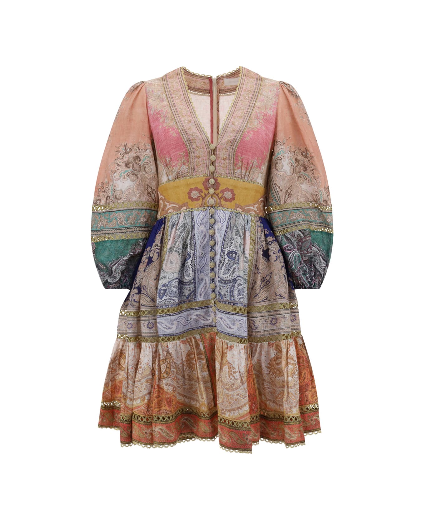 Linen anneke lantern dress by zimmermann, v-neck front, gold-plated buttons, fitted bodice, balloon sleeves with elasticized cuffs, wide flounced skirt, midi pattern, invisible back zipper closure, all-over multicolor pattern, lined dress.
