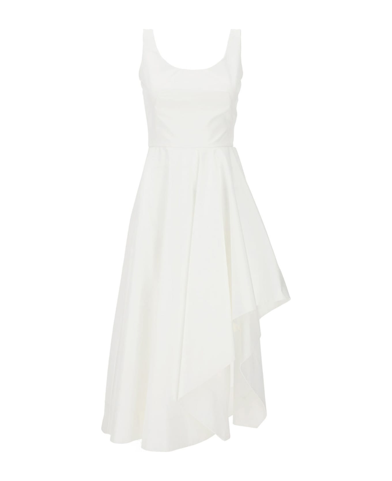 Asymmetric polyfaille dress featuring a wide skirt, slim bustier with a closure at the back and a wide neckline at the front and back. Composition: