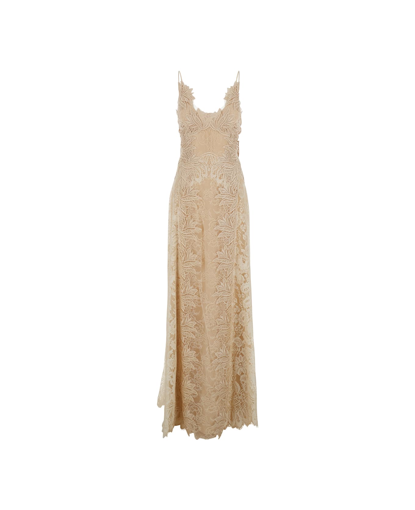 Beige Long Dress With All-over Lace Details And Thin Straps In Cotton Blend Woman