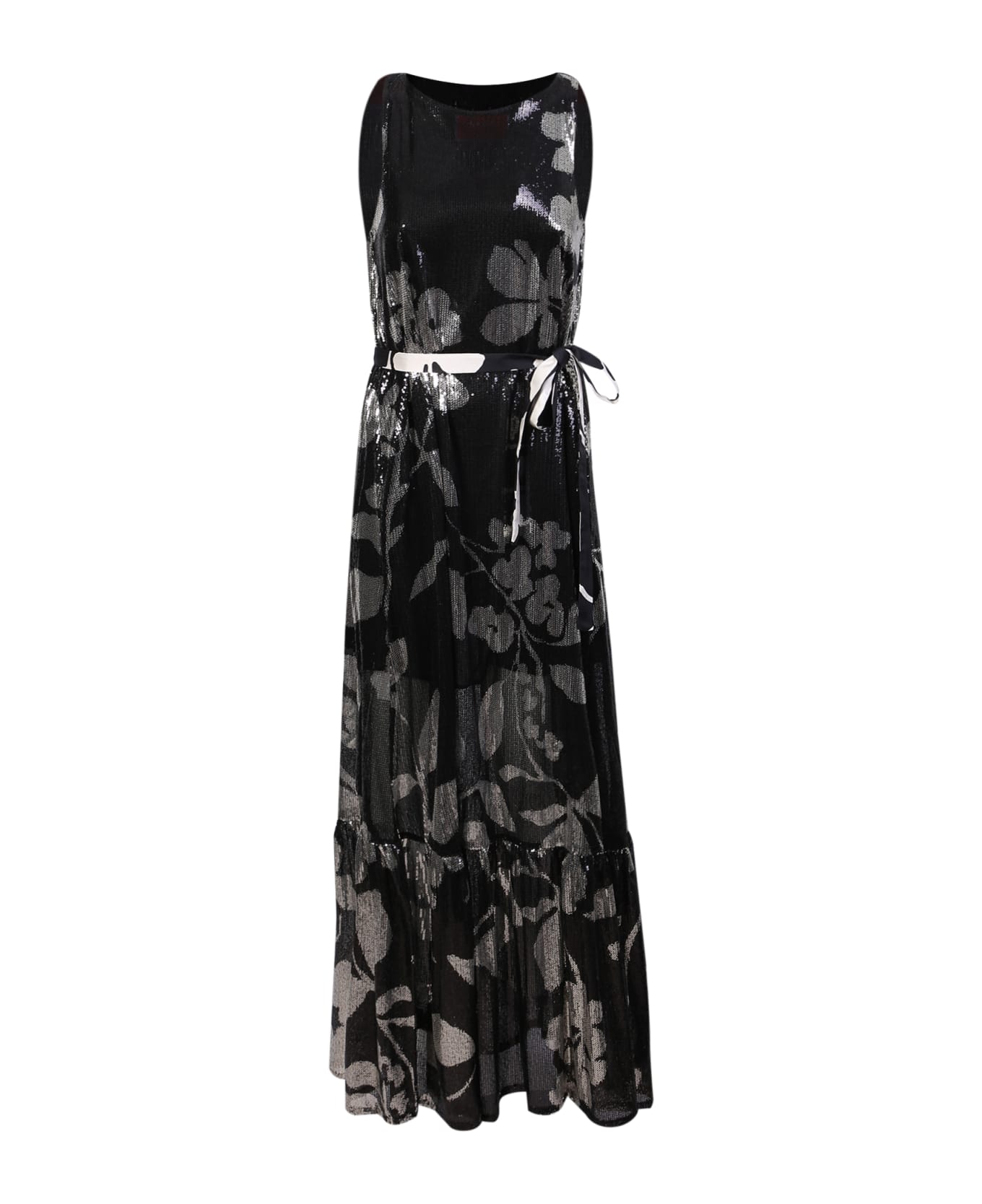Boat neckline. Sleeveless. Covered with sequins. Two side pockets. Removable silk belt. Floor-length. Flared hem. Color: black/ gray
