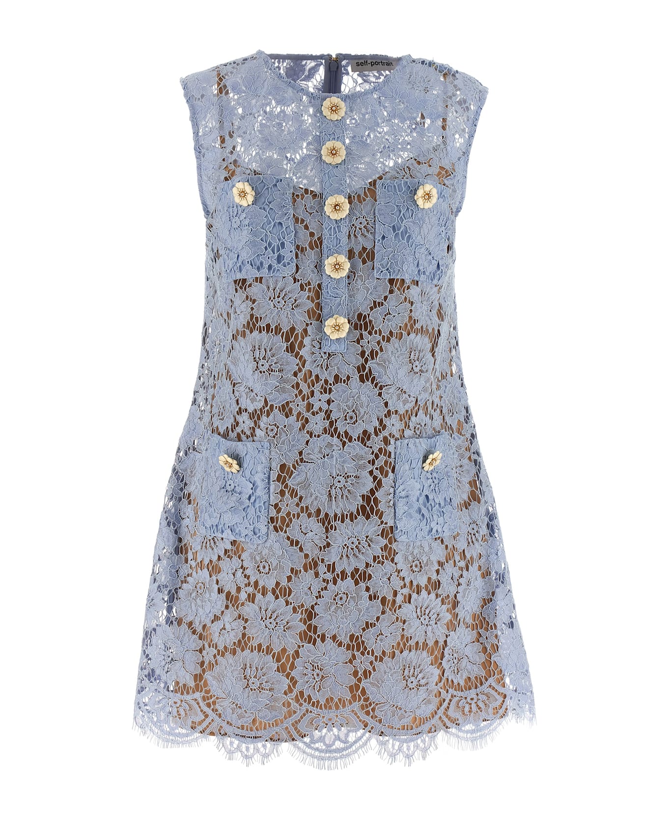 'Blue Fine Lace Mini' lace dress I don't see, crew neck, sleeveless, jewel buttons, pockets, back zip closure, removable petticoat.