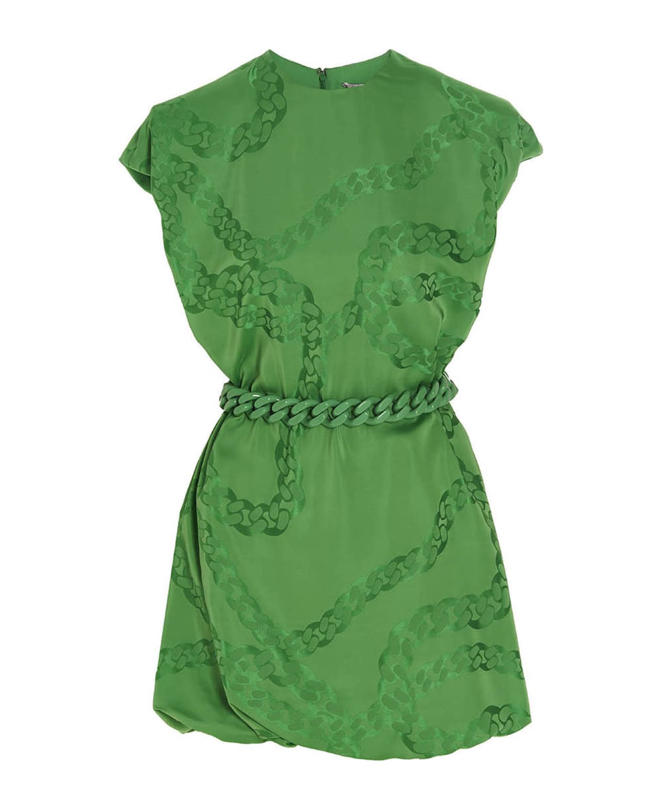 'Chain Jacquard' viscose and silk blend dress, with all-over Falabella tone-on-tone chain print Round neckline, flap sleeves with plunging set-in, padded shoulders, inner balcony, concealed zip closure, a tone-on-tone Falabella chain clip belt, fully lined.
