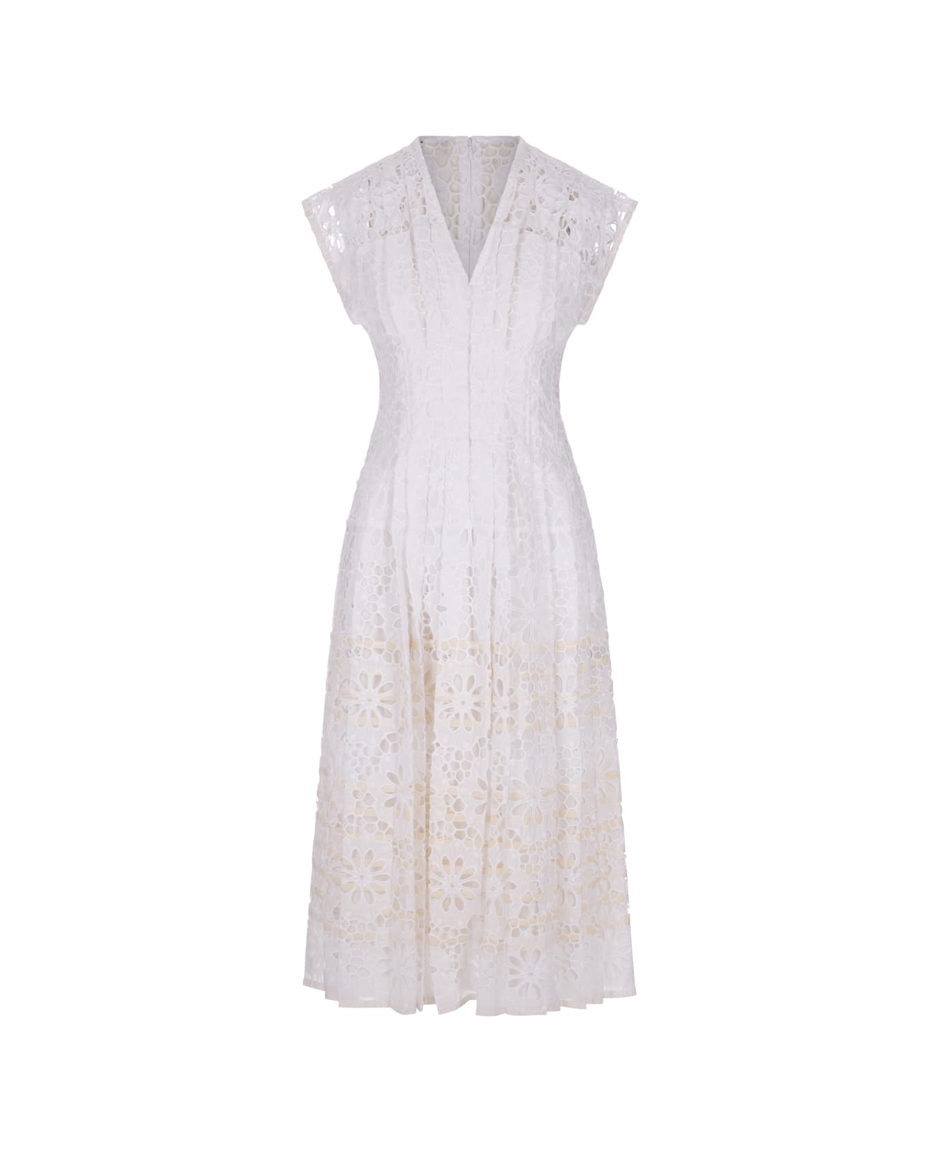Claire McCardell dress in white by Tory Burch in a delicate floral lace with light stripes. The openwork cotton of the dress builds delicate pleats from the shoulders to the hem, with the waist defined by precise darts and hook-and-eye closures, an iconic Claire McCardell detail. Pockets at the sides bring practicality, and a voluminous midi hemline brings balance to the proportions. The garment features a removable petticoat with bra supports on the straps. Hook-and-eye front fastening at the centre and concealed hook-and-eye zip fastening at the back. Length: 124. 5 cm in a size 4. Mid-calf length.