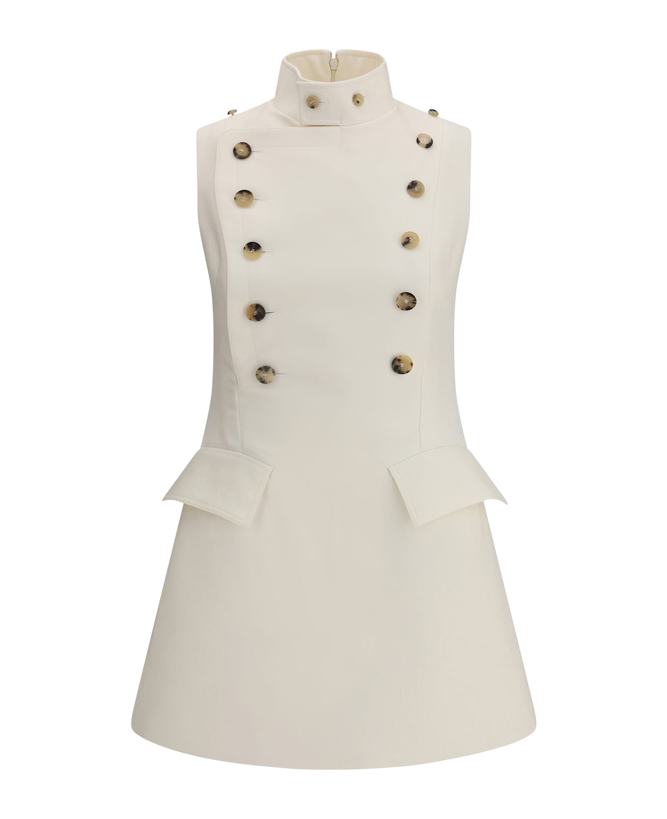 Alexander mcqueen's wool day mini dress is a sleeveless design with a concealed back panel zipper closure. it features a high buttoned collar and a front button closure. two welt pockets with flaps are positioned at the front, while a martingale at the back adds a touch of structured elegance to the design. Composition: 100% % Wool