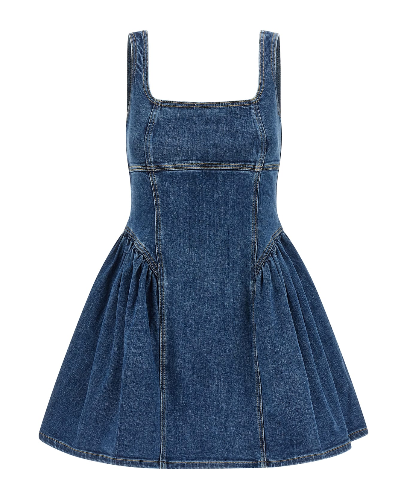 Mini dress in slightly stretch cotton denim with plunge round neckline, skater-style skirt with ruffles on the sides, shoulder straps, back closure with exposed metal zip.