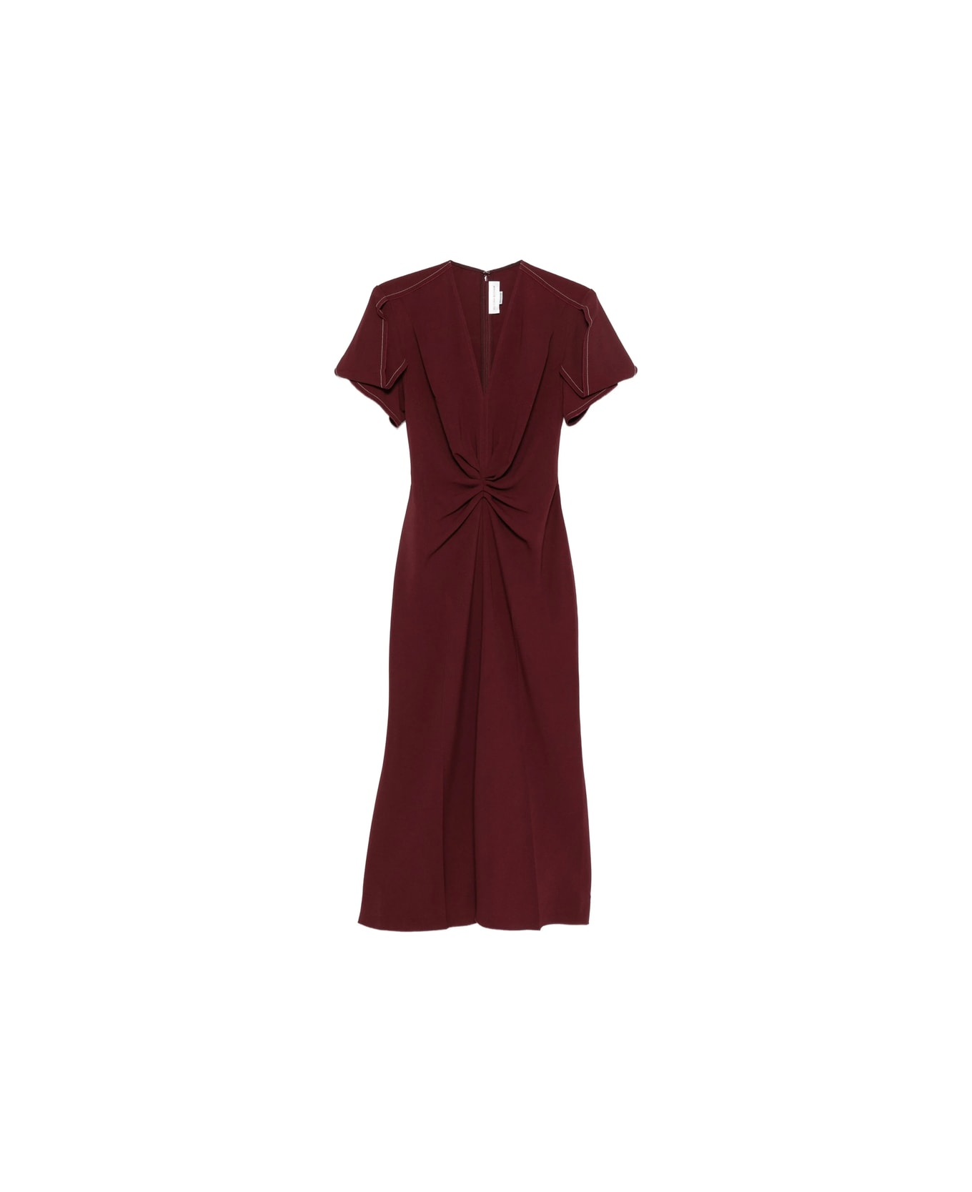 cinnabar red v-neck twisted front short sleeves seam detail concealed zip fastening