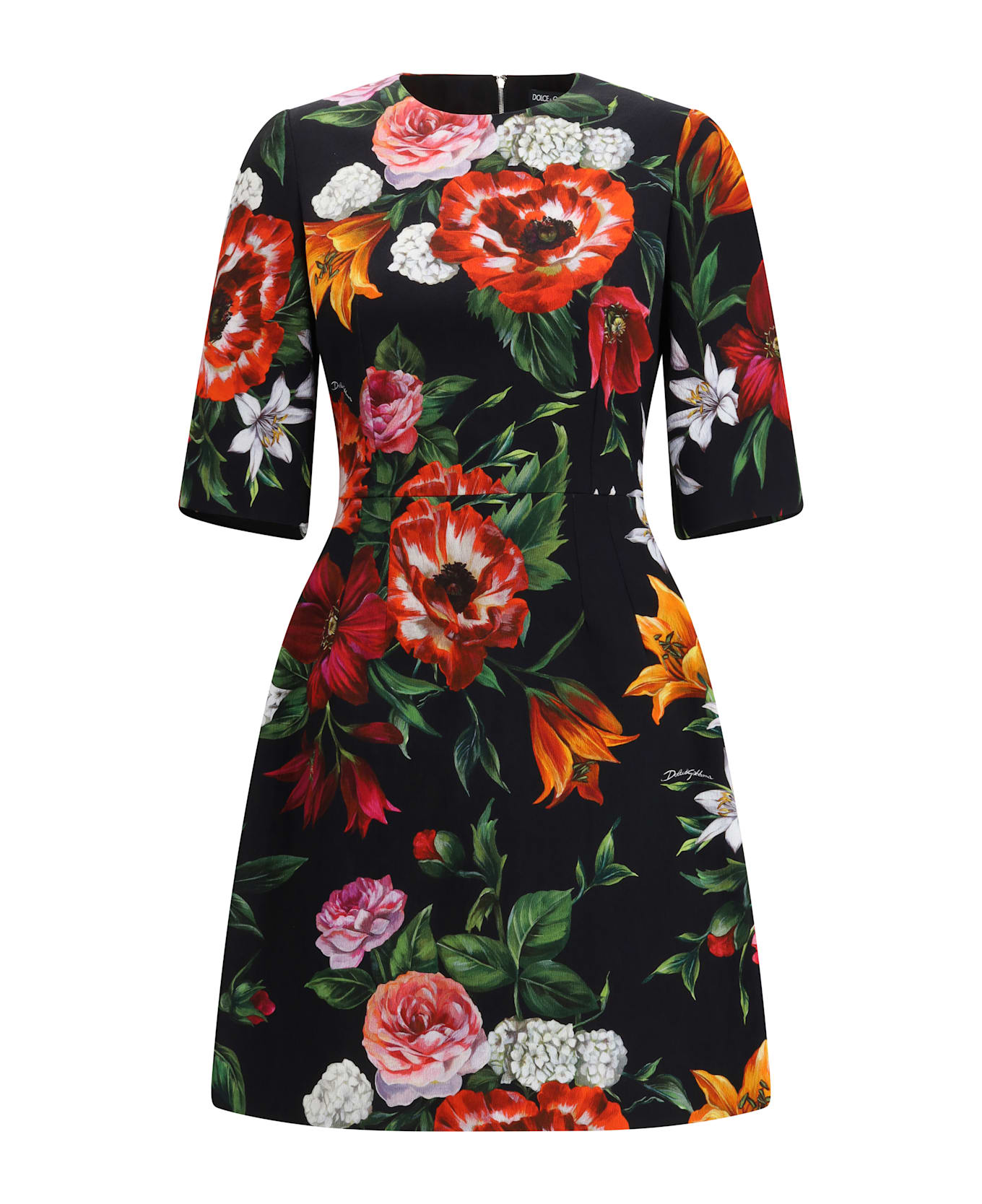Dolce&gabbana's floral midi dress embodies femininity and romance with its refined design. featuring a delicate round neckline, 3/4 sleeves and a back zipper closure, it has a well-defined waist that enhances the silhouette. the flared skirt adds movement and grace for an elegant and timeless look.