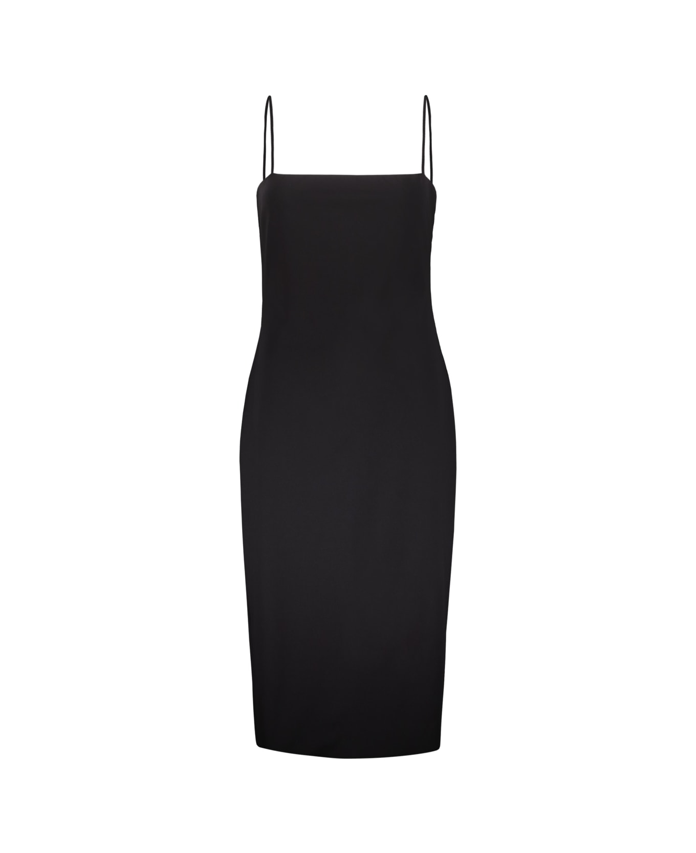 The Row Haku dress in stretch jersey with fine shoulder straps, inner shelf bra, mid-calf length hemline.