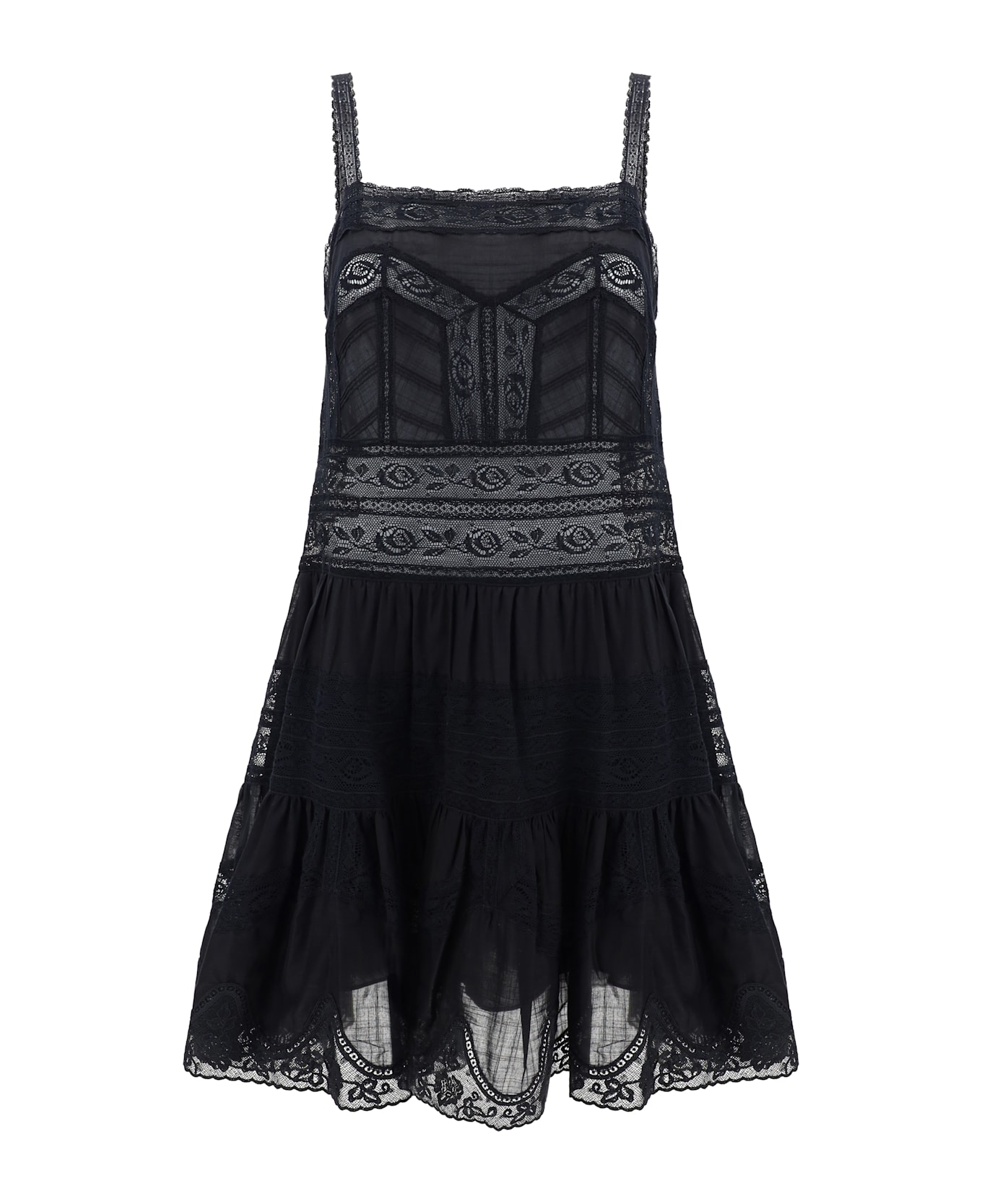 Cotton mini halliday lace trim dress by zimmermann, fabric embellished with lace details with semi-transparent cut-out effect fabric, thin straps, soft mini skirt.