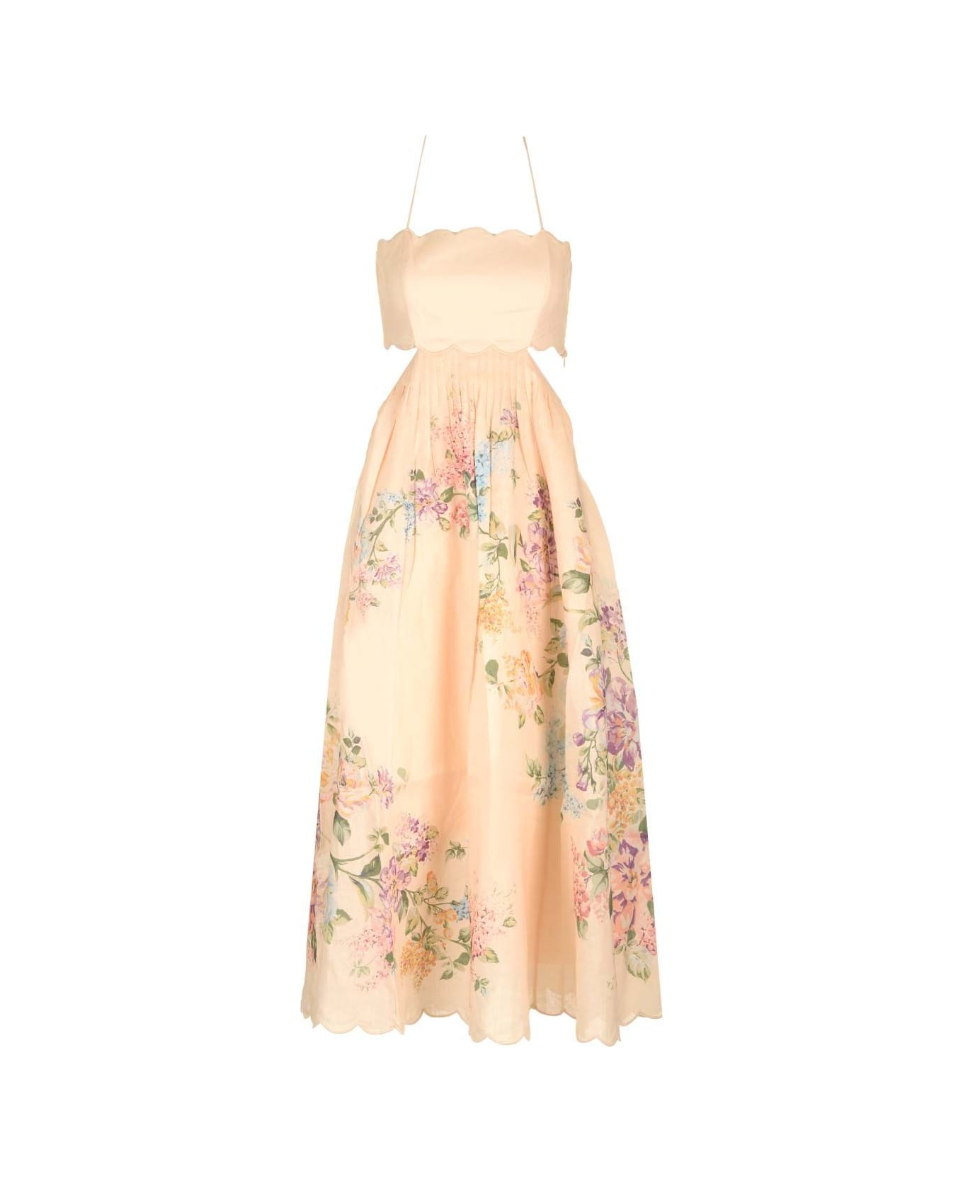 'Halliday Scallop' midi dress in cream watercolor floral linen from Zimmermann, with cutouts at the waist, side pockets and lace bodice to the back, finished with embroidered scalloped edges.