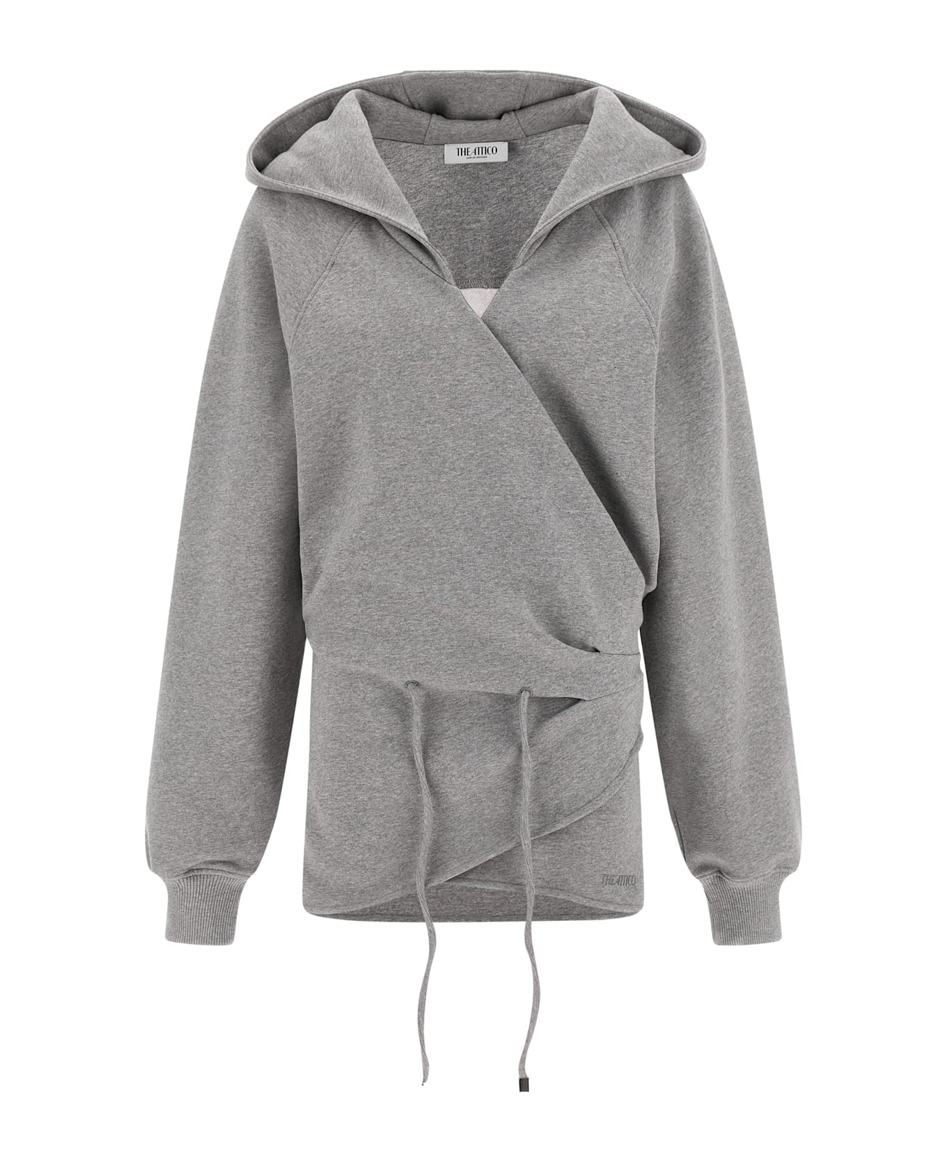 American mélange fleece hooded mini dress with wallet style with wide V-neck, tone-on-tone logo embroidery on the front, drawstring at the waist, long wide sleeves with cuffs. Composition: 100% cotton